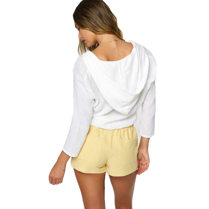 This is a unique woven hoodie to freshen up your closet. It features a 3/4 sleeve design, inset embroidery details and fits relaxed on the body.