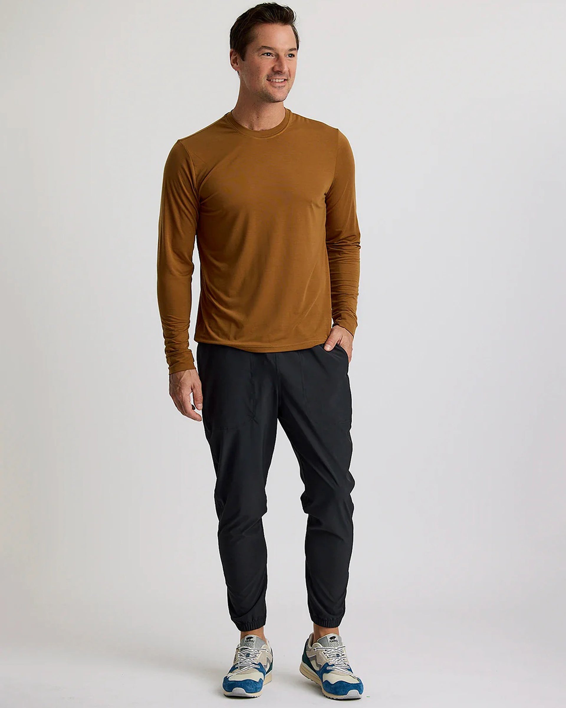 A jogger you can actually jog in. We built our Breeze Active Jogger out of our all-time bestselling Breeze fabric and followed with a wide knit waistband for ultimate comfort, along with sewn on hand pockets to avoid the dreaded bounce when you’re out there on the move. Add a secure zipper pocket on the right hip for easy phone storage and a tapered leg with an integrated cuff, and you get a high-performance pant cut for comfort and ready for action.
