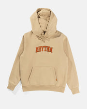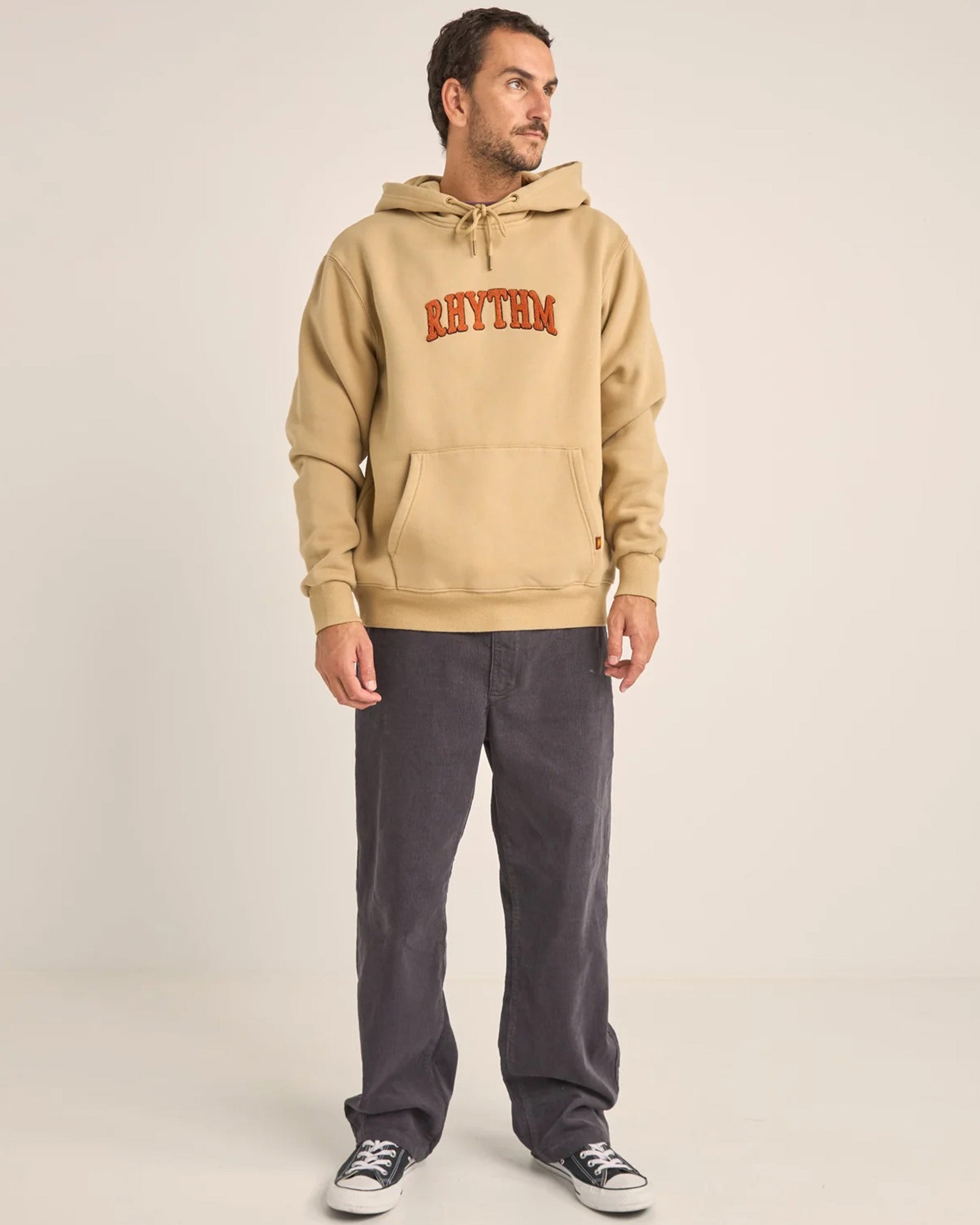 The Sand Arch Heavyweight Fleece Hood is for those seeking extra warmth, crafted from a cotton and poly blend, and weighing in at a satisfying 400gs. Boasting a heavyweight fleece, custom chenille embroidery, jersey lined hood, cotton drawstring, pouch pocket, and Rhythm trims, been made to keep you cozy on even the coldest of days