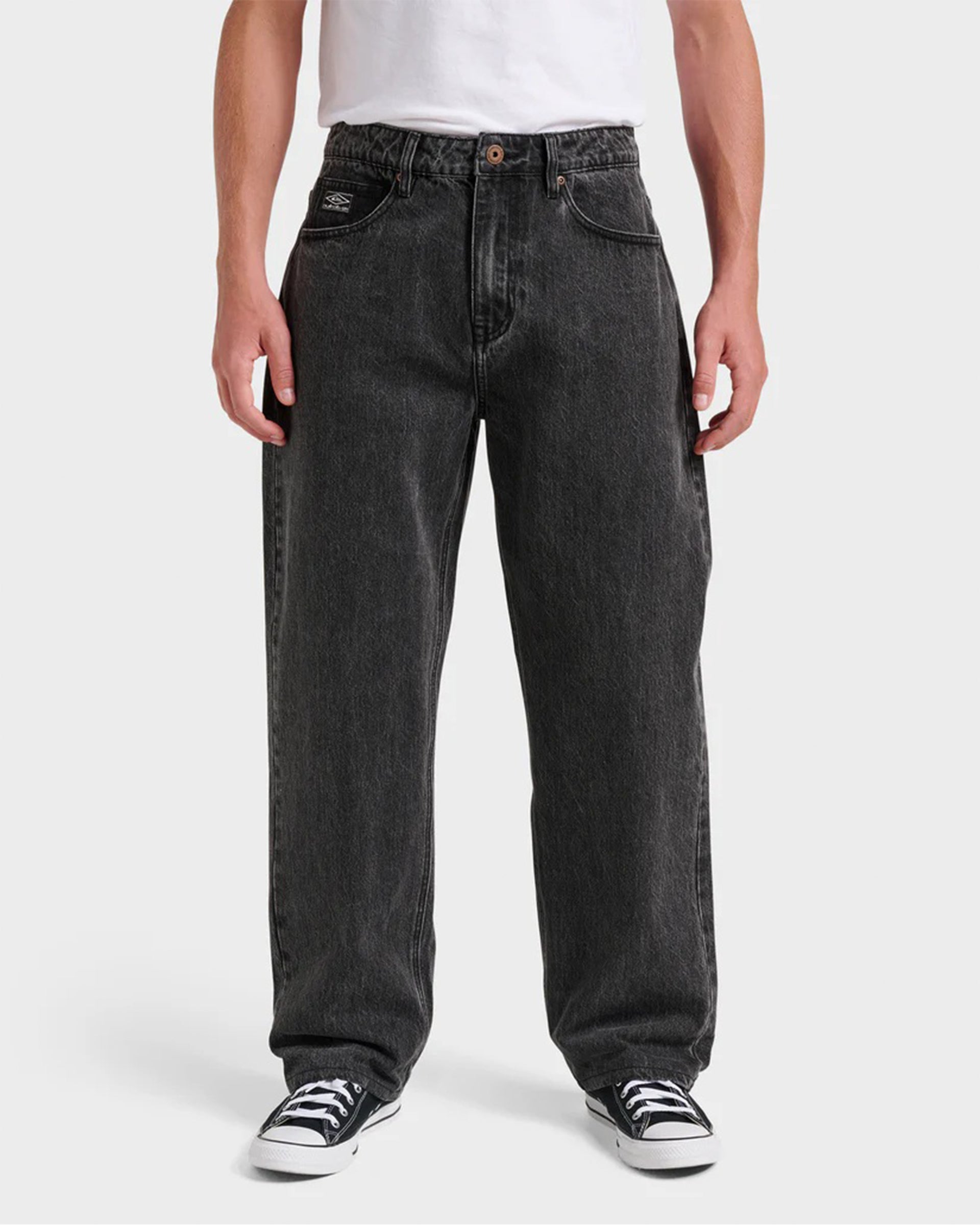 Our Baggy Denim Jeans Pants are the ultimate in relaxed style with a 29.5 inch inseam and roomy baggy fit. Made from heavyweight 13oz 100% cotton black denim, this 5 pocket pant features a cool denim wash finish and diamond label branding on the pockets. A perfect blend of comfort and casual street style. Featured here in the Black Wash colorway.
