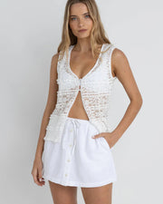 The Beach Side Skort in White is perfect for sunlit days on the sand. Made from 100% cotton, it features a mid-high rise relaxed fit, elasticated front and back waist, and self drawcord. With a front button opening on the skirt and internal shorts, it offers a stylish yet comfortable fit for sun-filled days spent by the beach