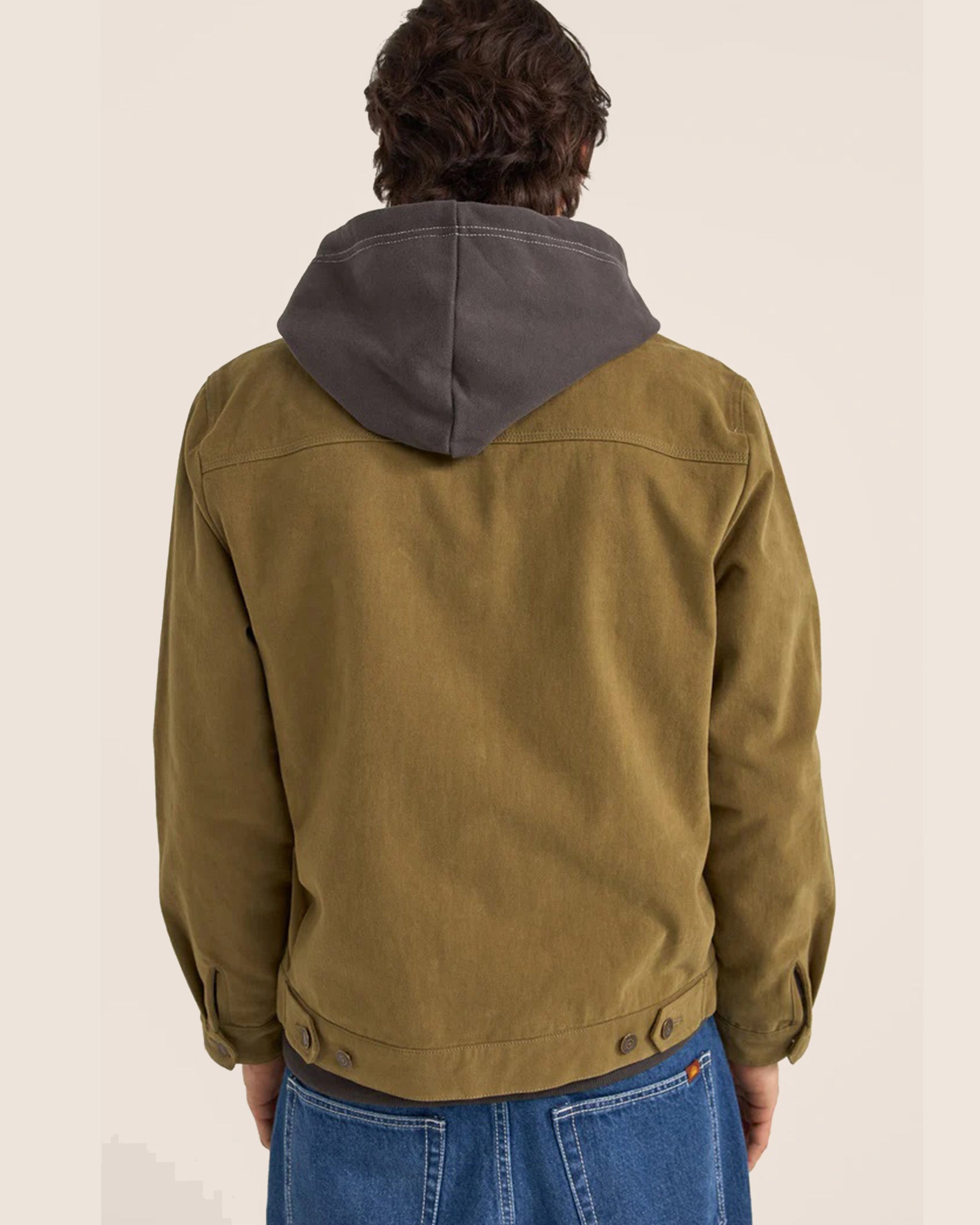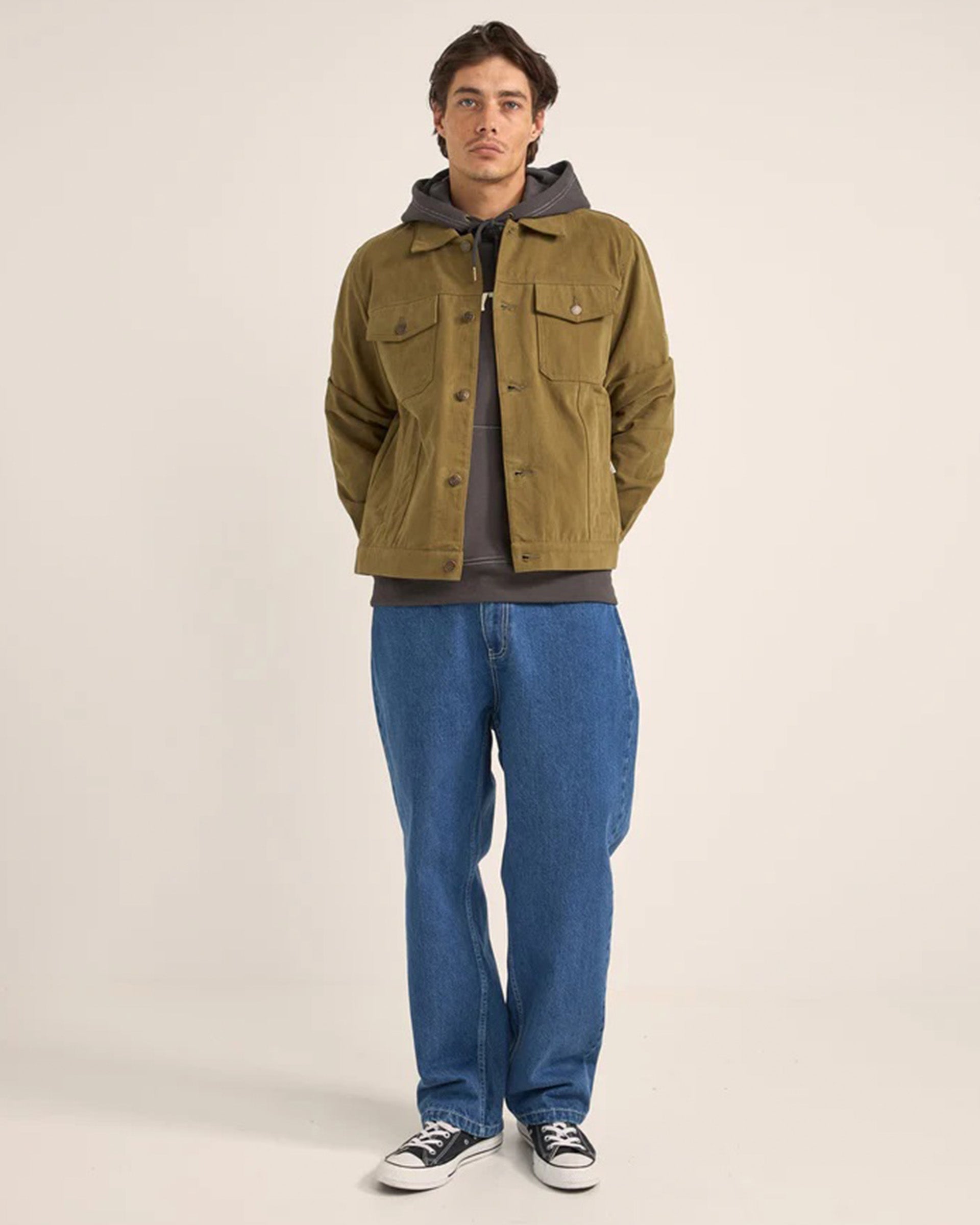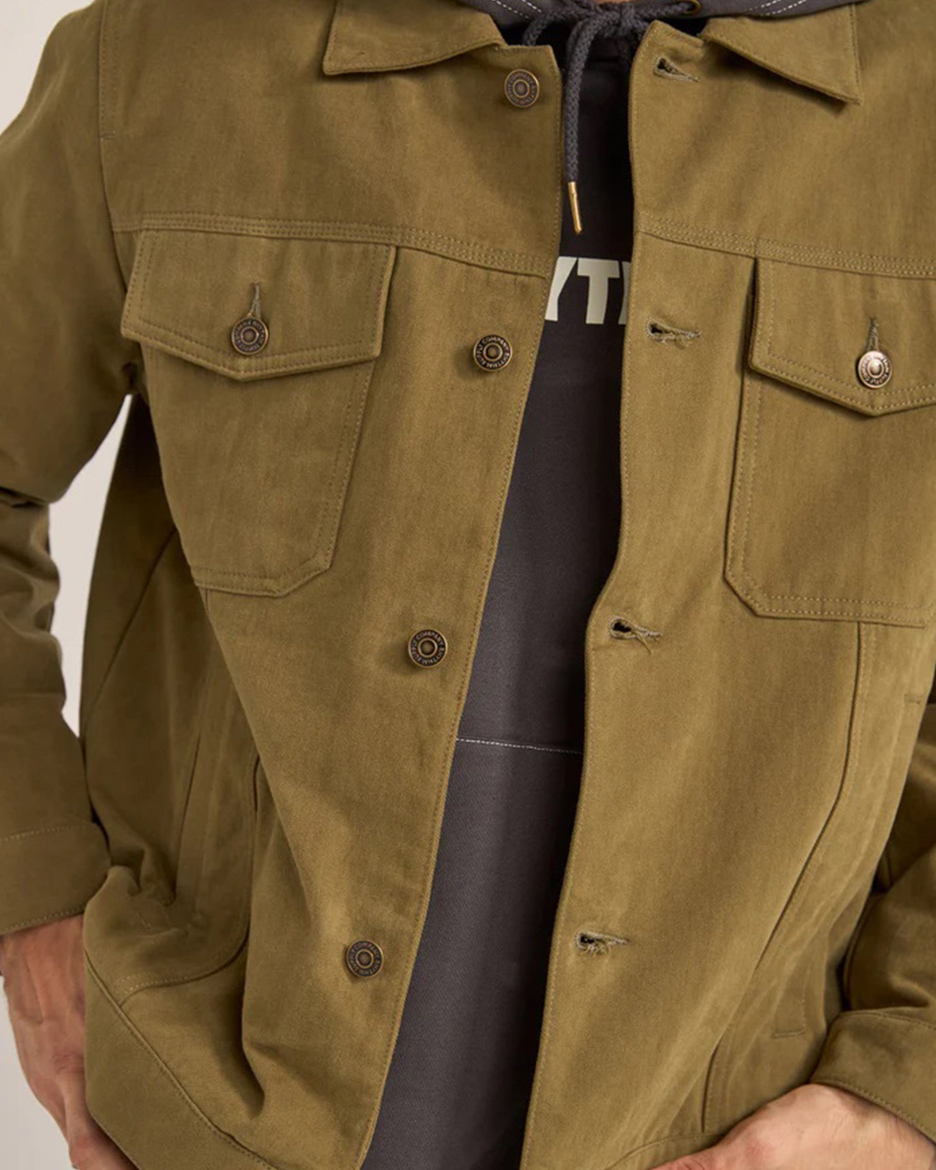 The Olive Brushed Twill Trucker is an emblem of timeless style. Featuring 100% brushed cotton twill for a soft touch, it's equipped with metal shank closure, chest patch pockets, welt hand pockets, and waist adjustment, making it a durable and stylish staple for wardrobe in any location