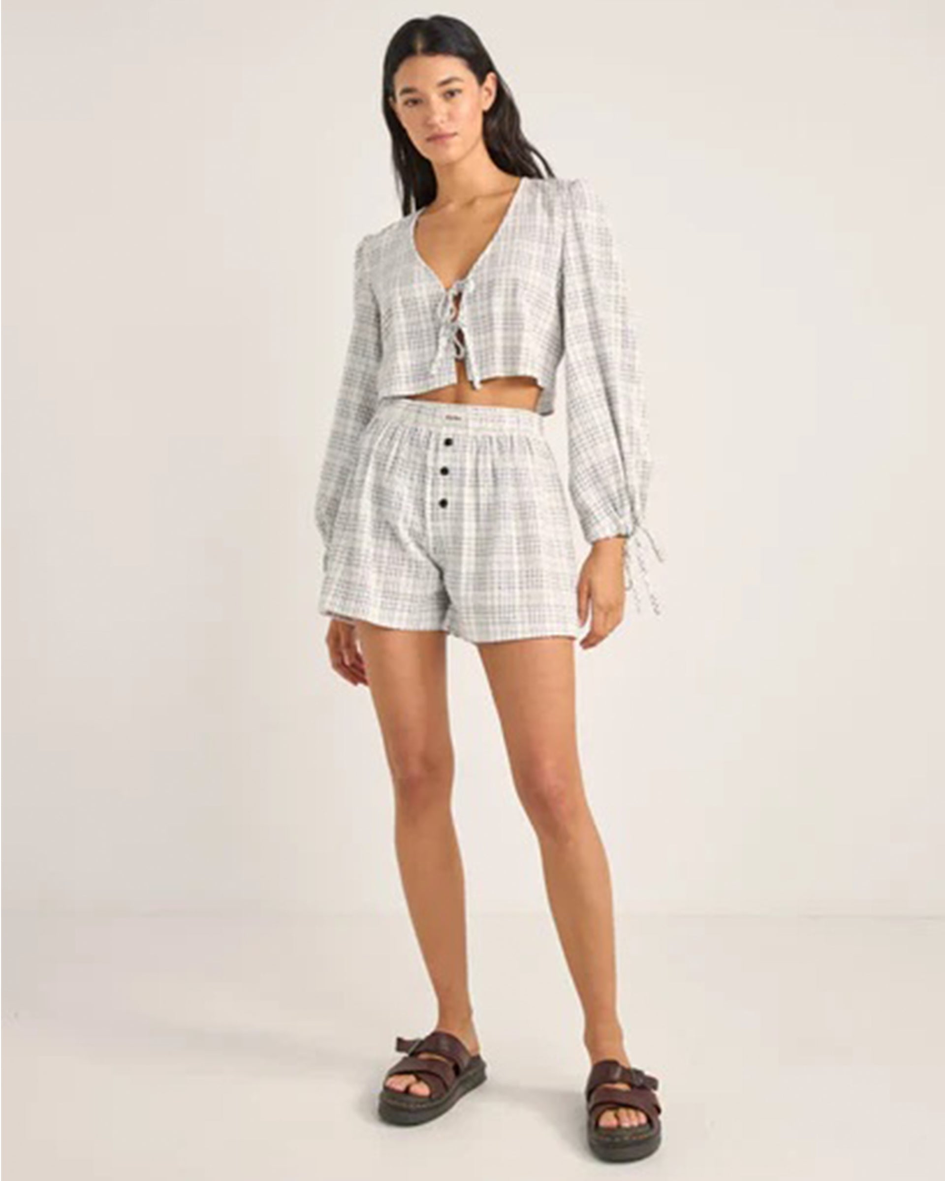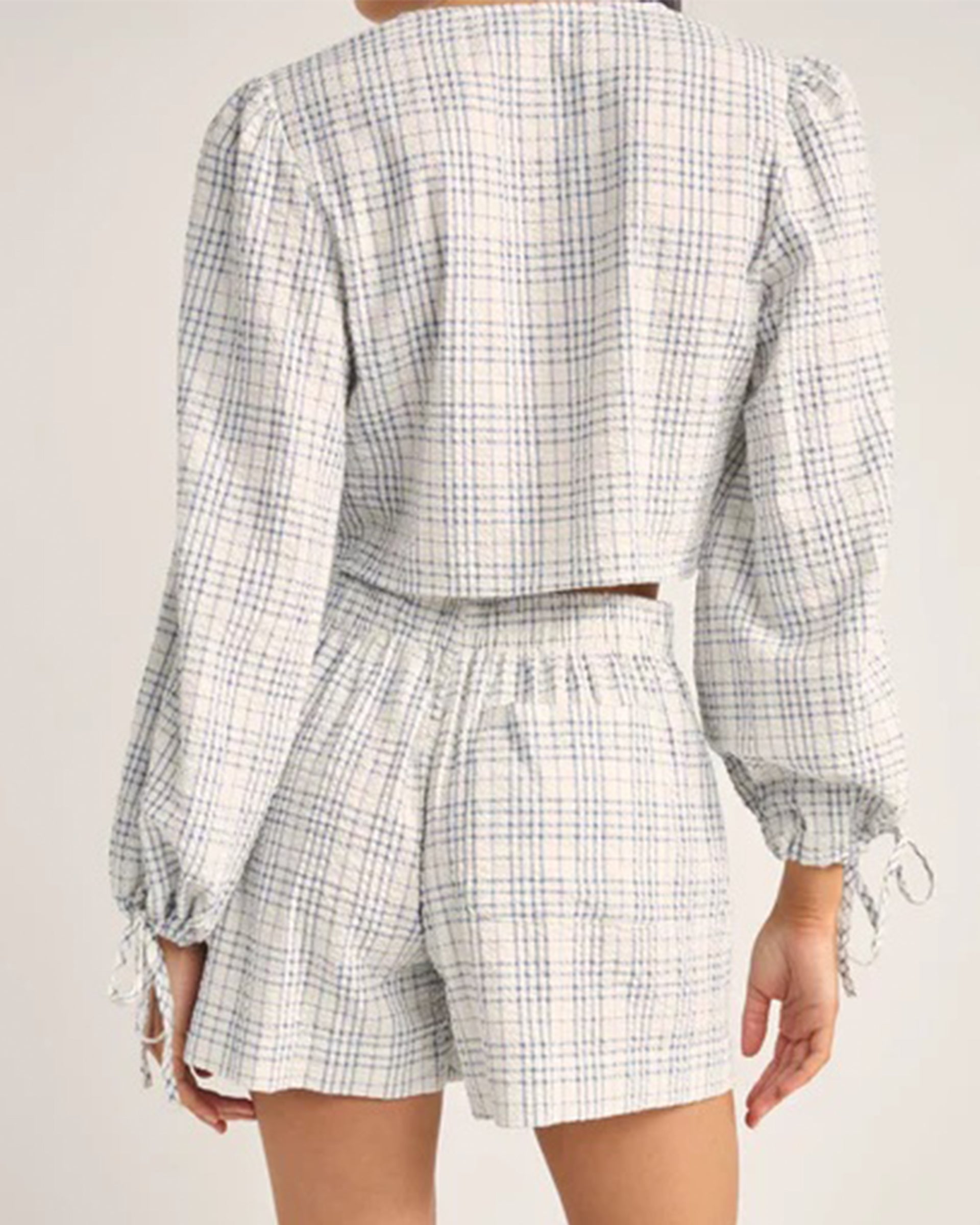 The Desi Plaid blouson top is a comfortable addition to the most stylish coastal collections. Made from textured check fabric.