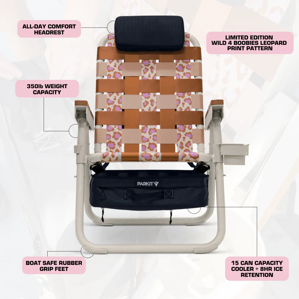 Built on PARKIT’s 3-in-1 foundation, chair, cooler, backpack, the Wild For BooBies Eclipse takes it further with three ergonomic recline positions, activated with the push of a button. Outfitted with stainless steel hardware, boat-safe rubber feet, and a built-in cooler, it’s engineered to hold up through campfires, sidelines, tailgates, and beach days.