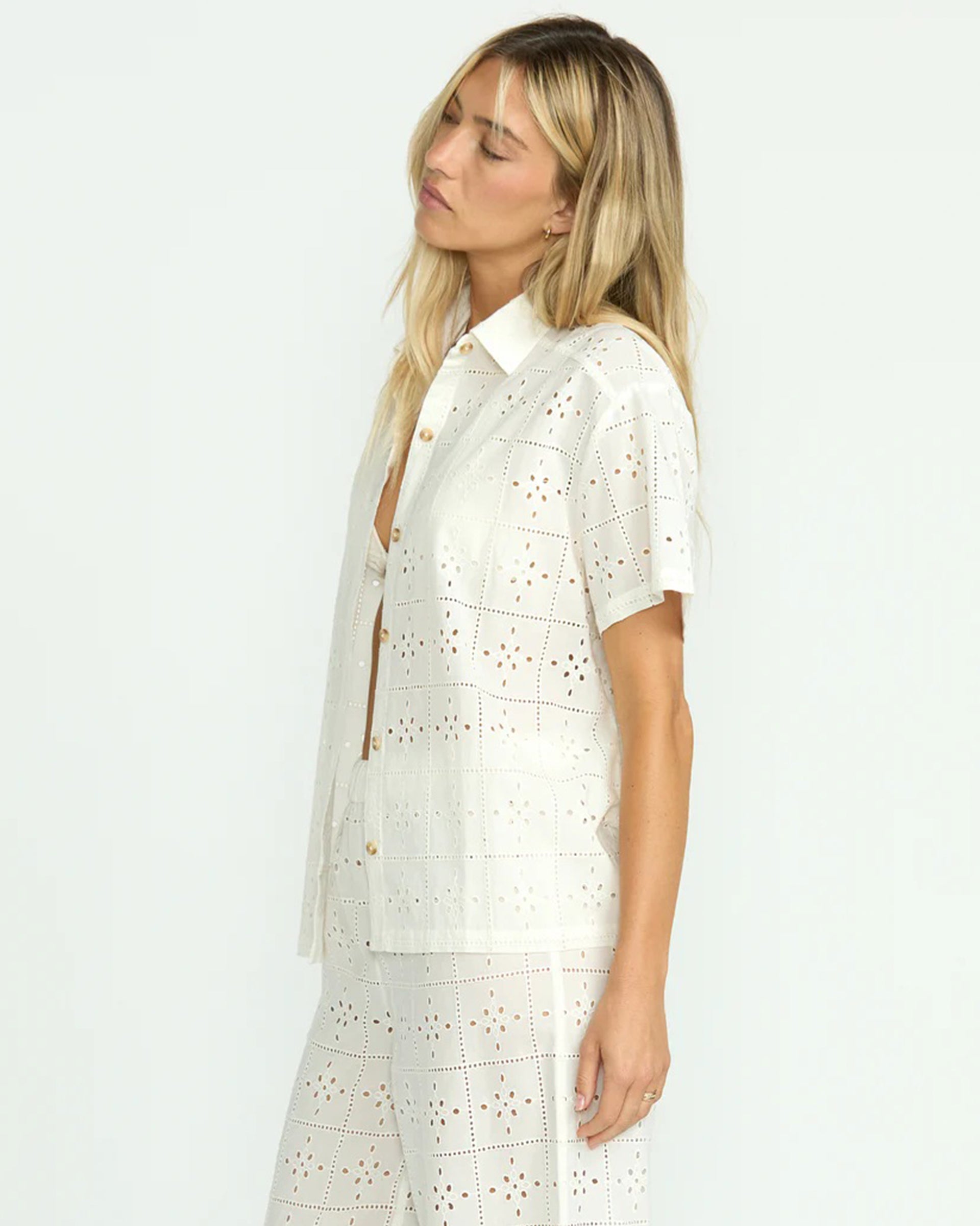 Our 100% cotton eyelet coverup top is oversized bliss. With short sleeves and a button-down closure, breezy yet structured, this women's shirt is ultra-lightweight, breathable perfection to throw on over swimwear or keep cool in casual style. In crisp white eyelet, it's a breath of fresh air.