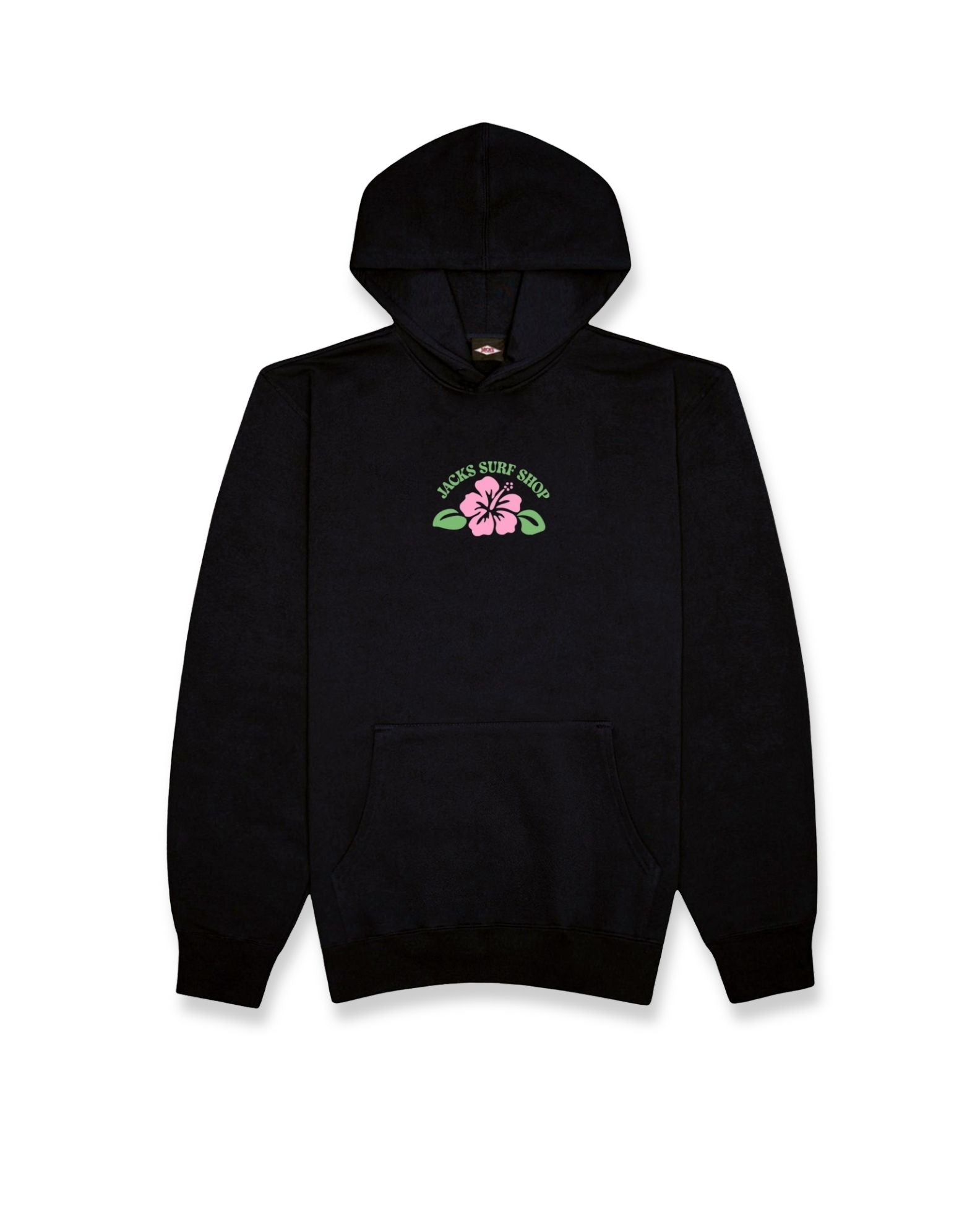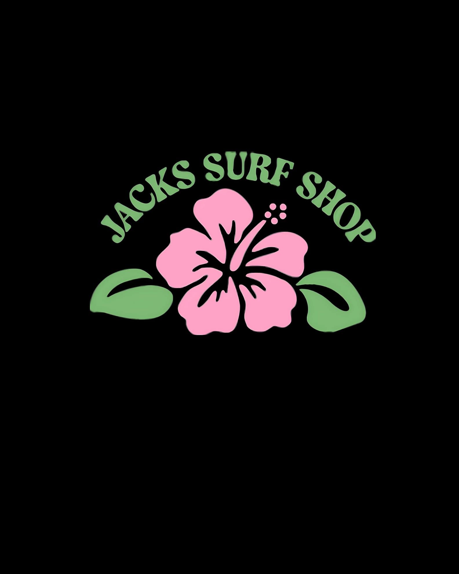 - Small print designs of "Jacks Surf Shop" and a hibiscus flower front center