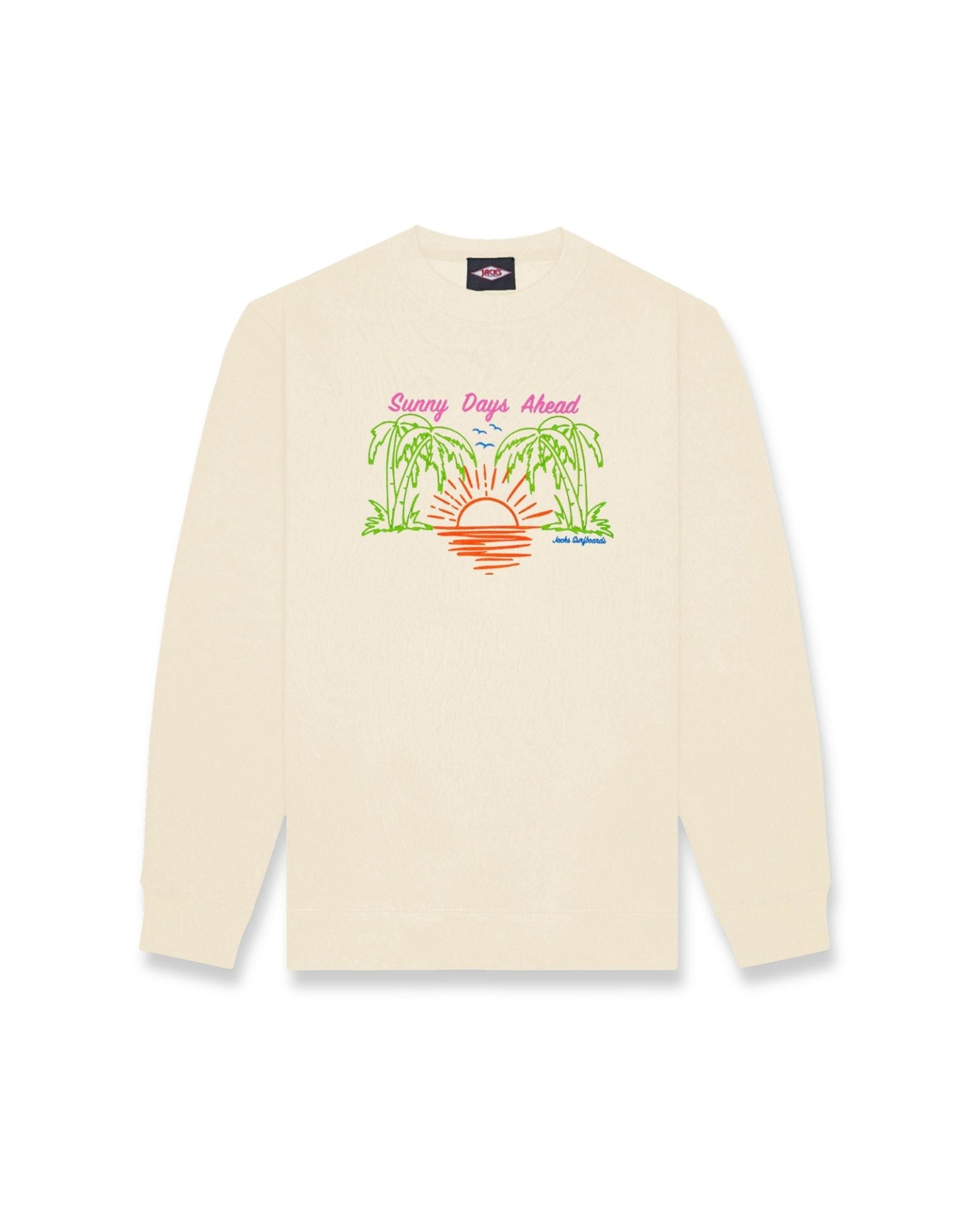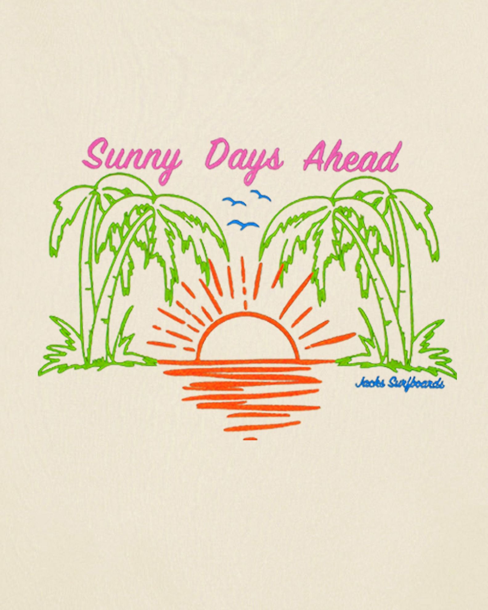 - "Sunny Days Ahead Jacks Surfboards", seagulls, palm trees and a sunrise over the water print front center