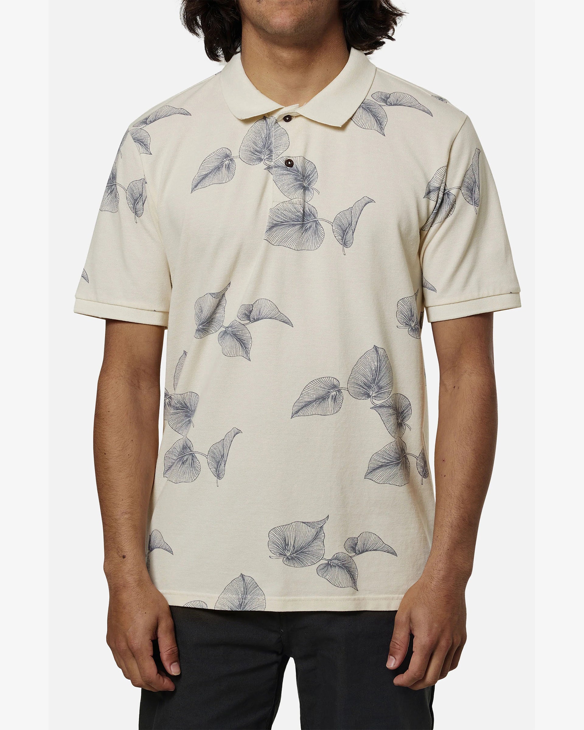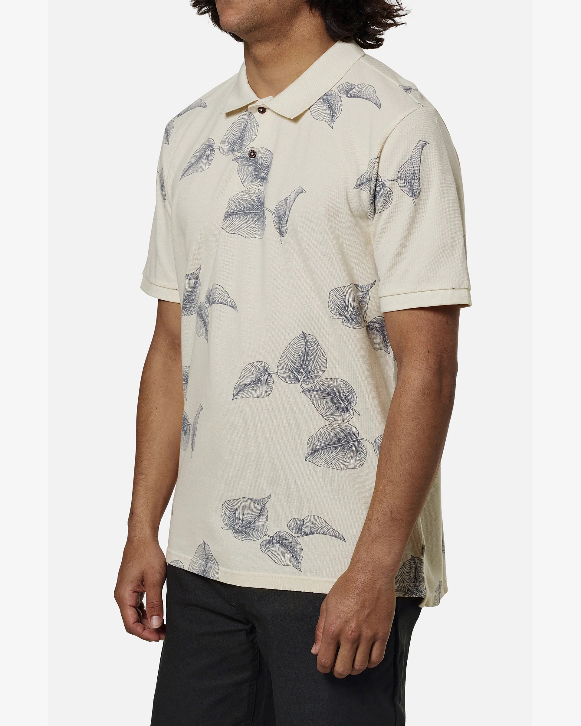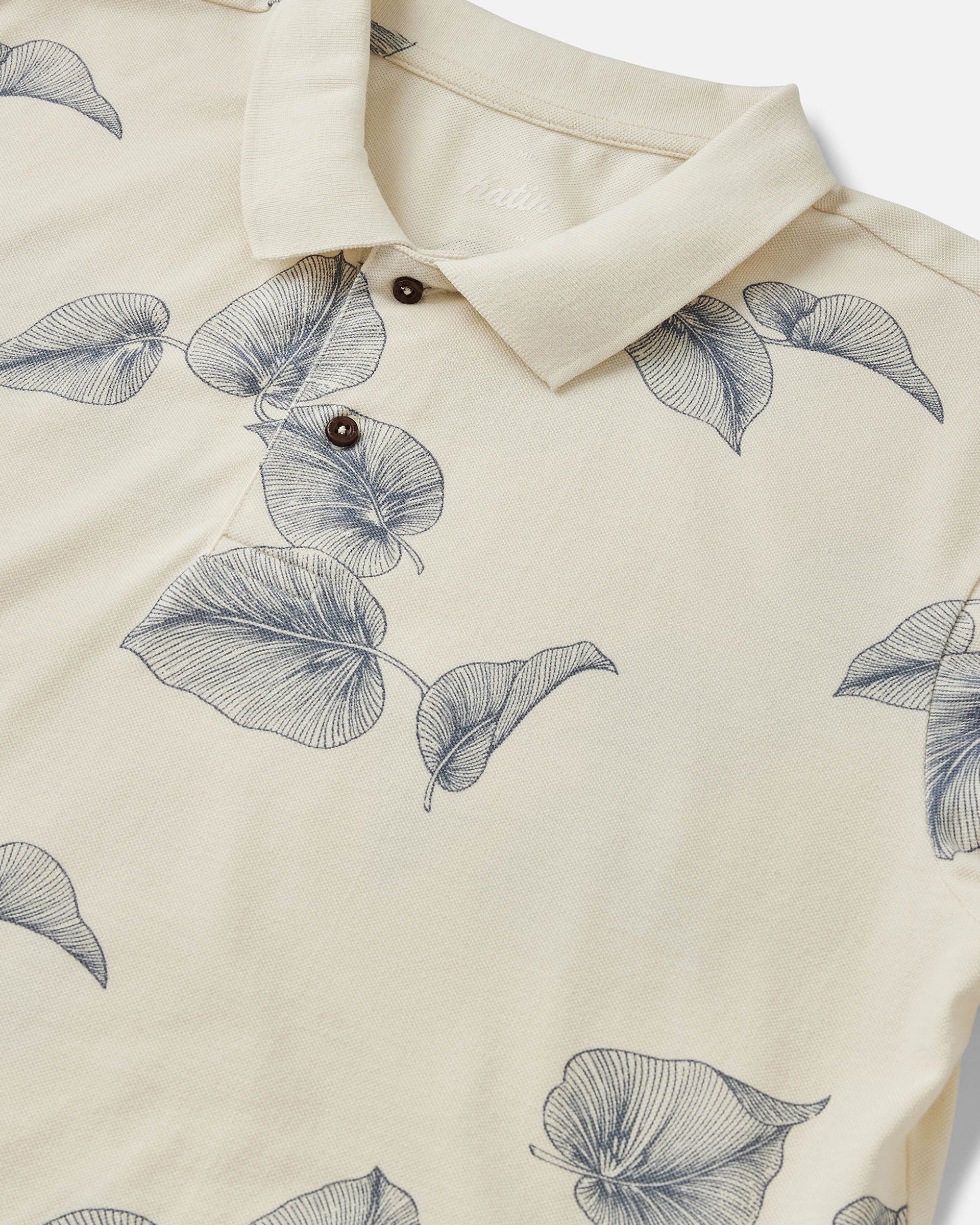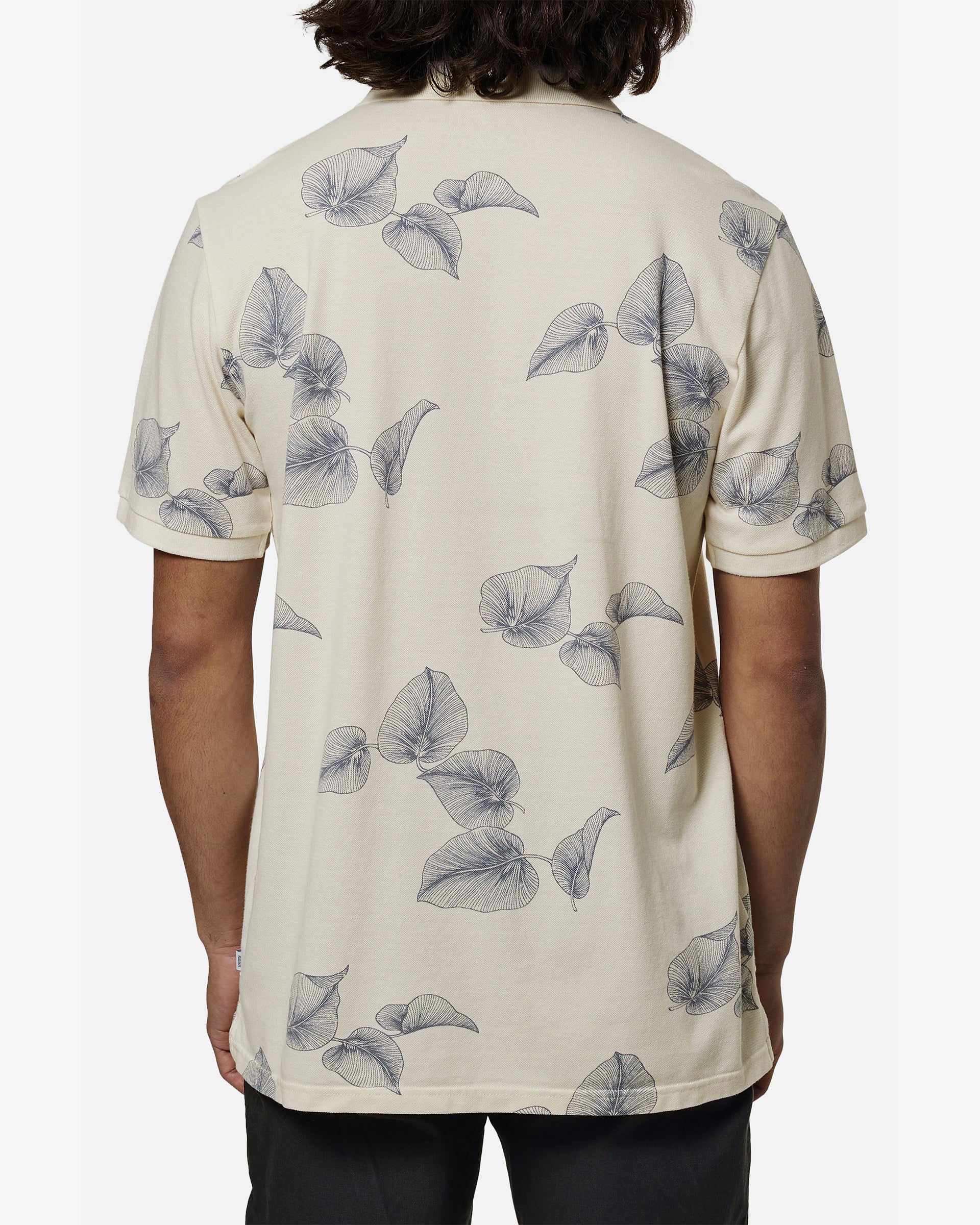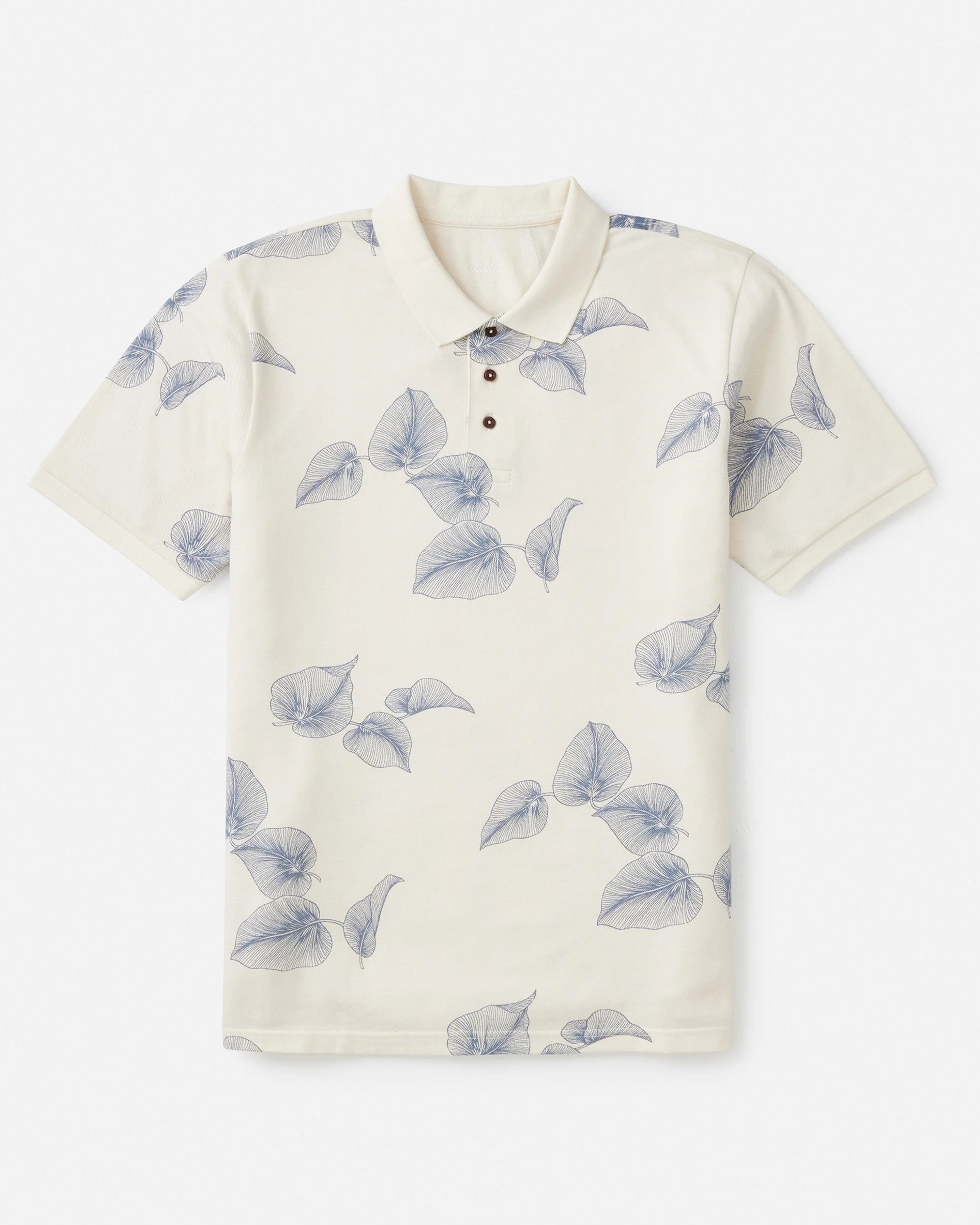 The Gust Shirt showcases a unique tropical leaf design and is made from cotton pique and features a three-button placket with collar.