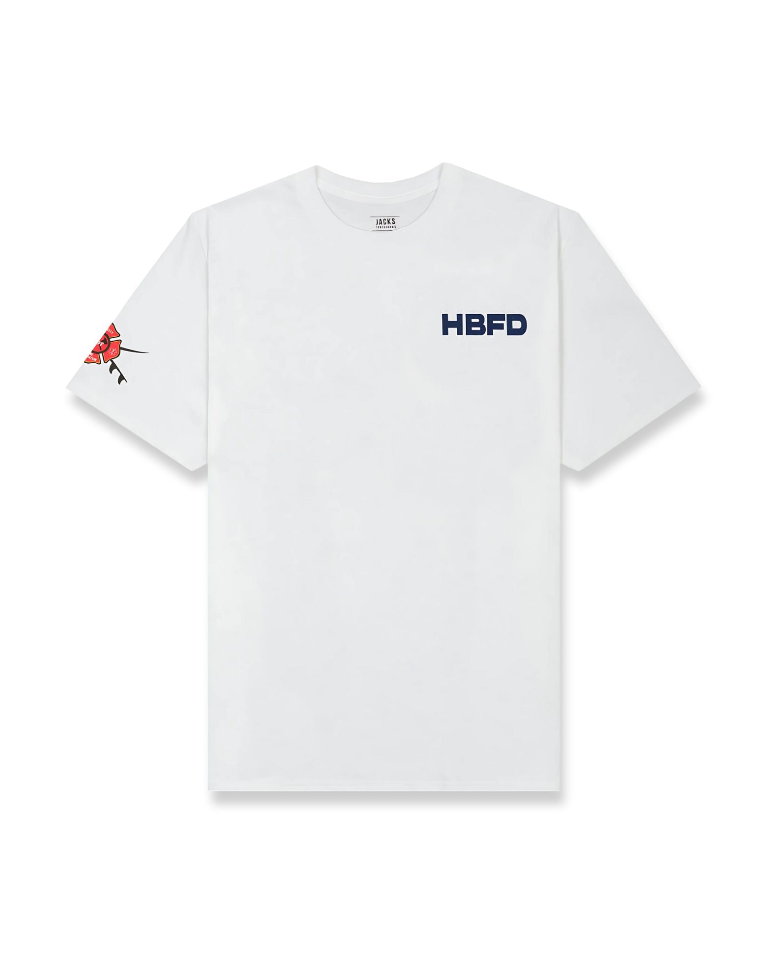 Show your beachside firefighter pride with the HBFD Pier Heavyweight S/S T-Shirt. This comfy short-sleeve tee features a classic crew neckline and a subtle navy "HBFD" on the left chest. The back bursts with colorful "Huntington Beach Fire Department" lettering above a lively pier illustration, while a firefighter badge decorates the right sleeve. Perfect for sunny days and casual vibes!