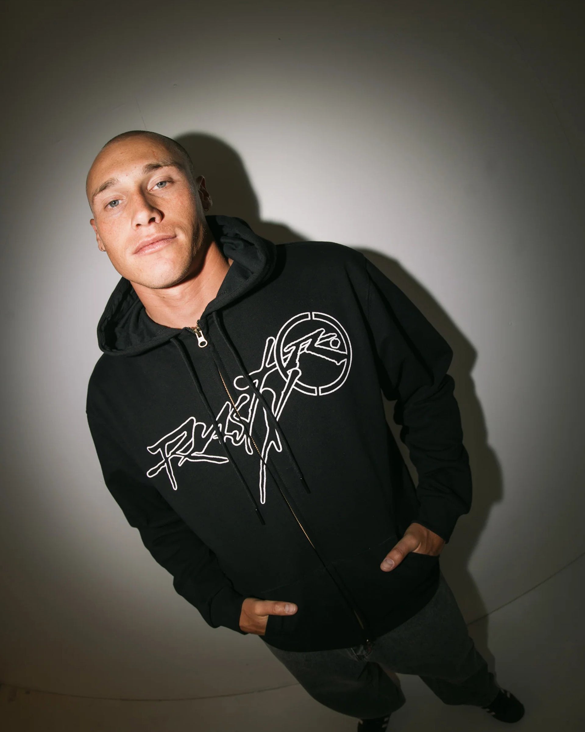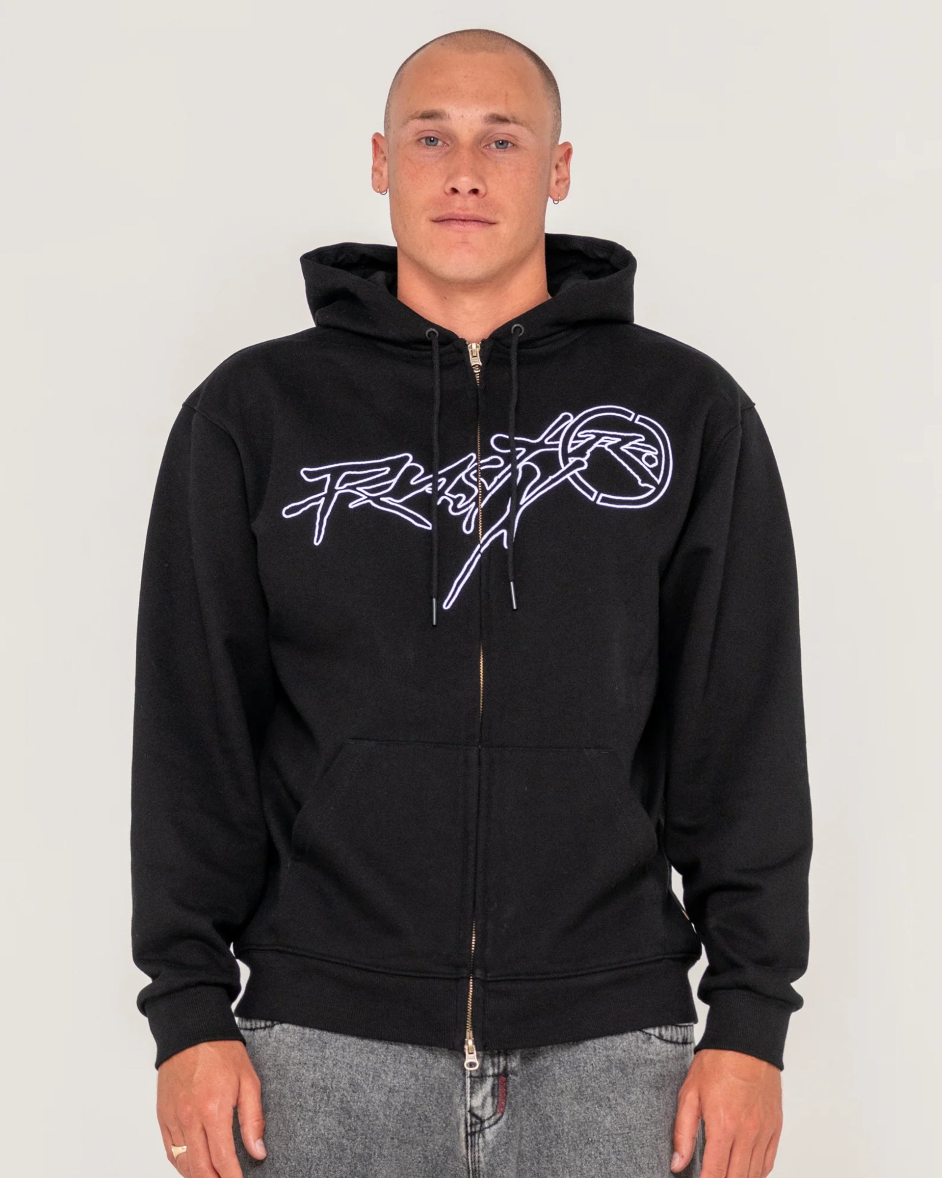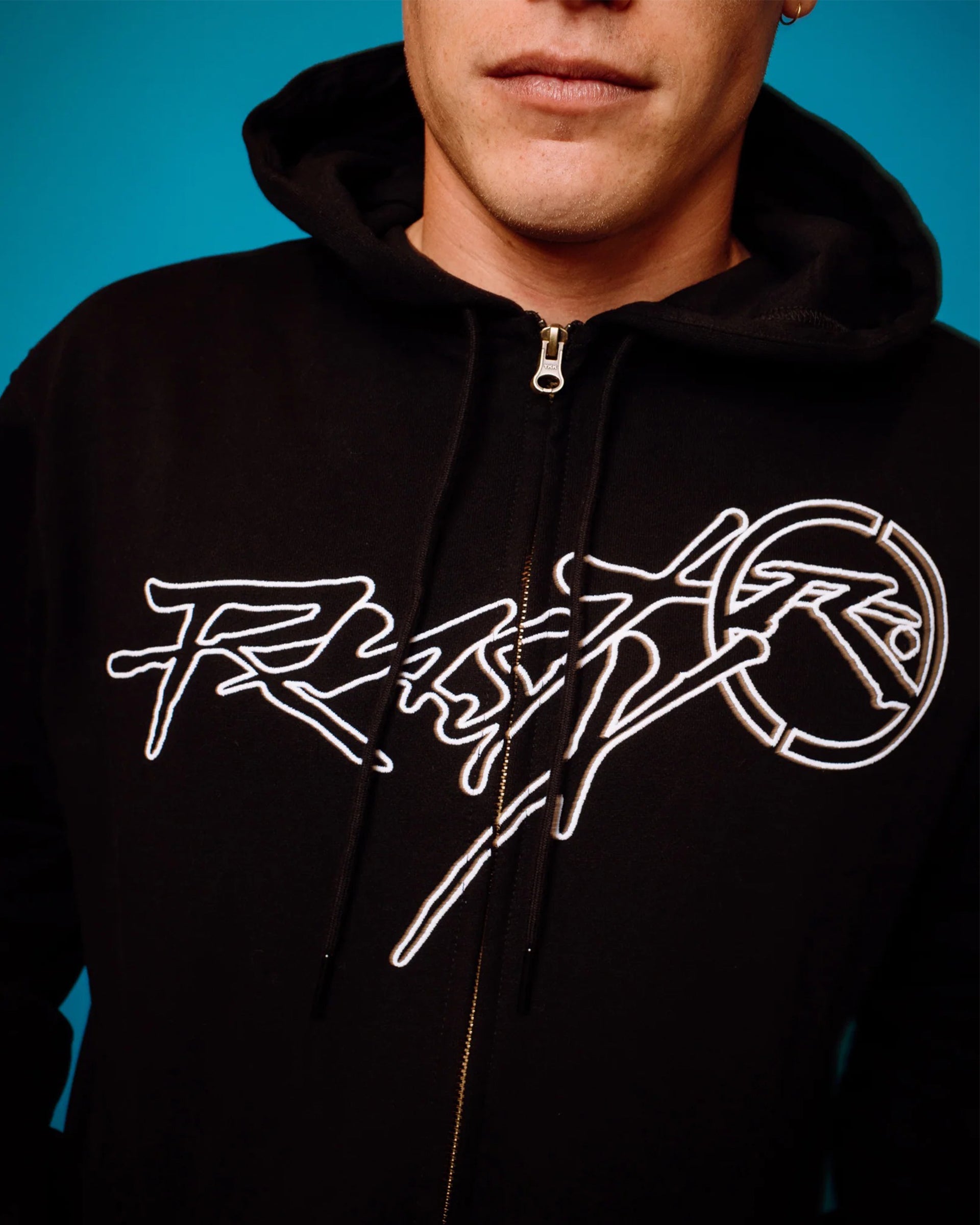 Relaxed R2K fit hoodie with full zip and Rusty embroidery.