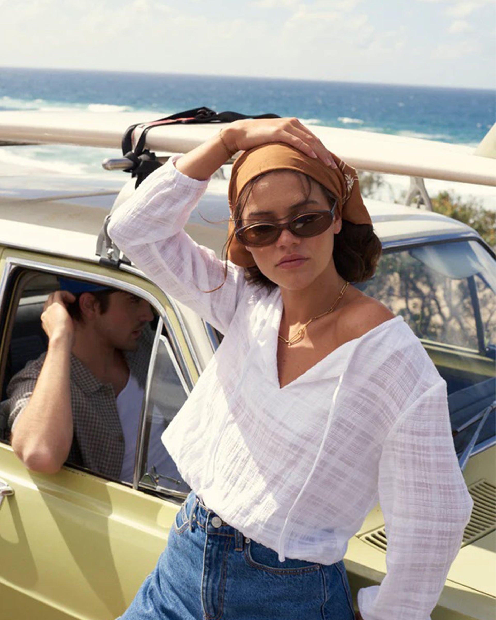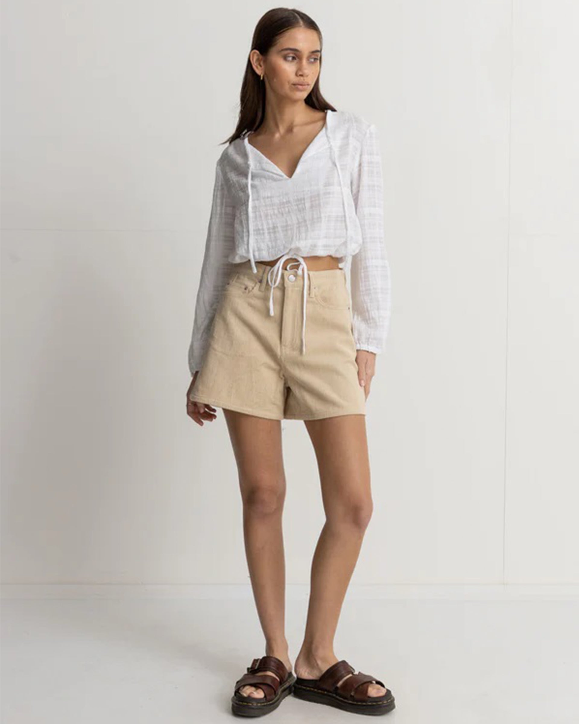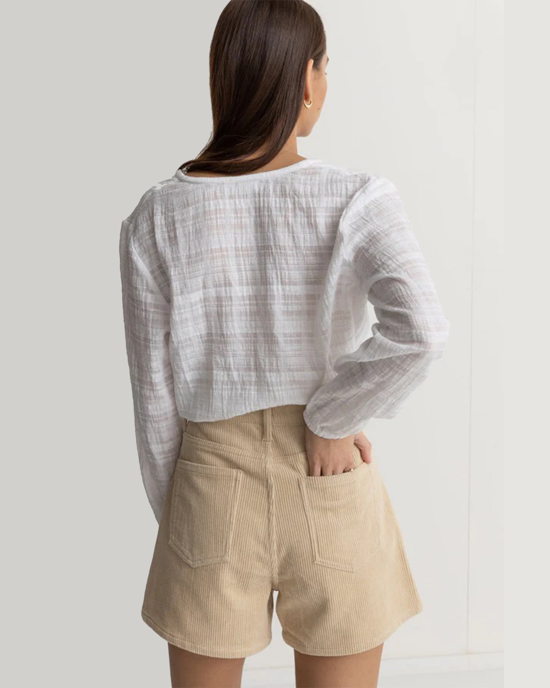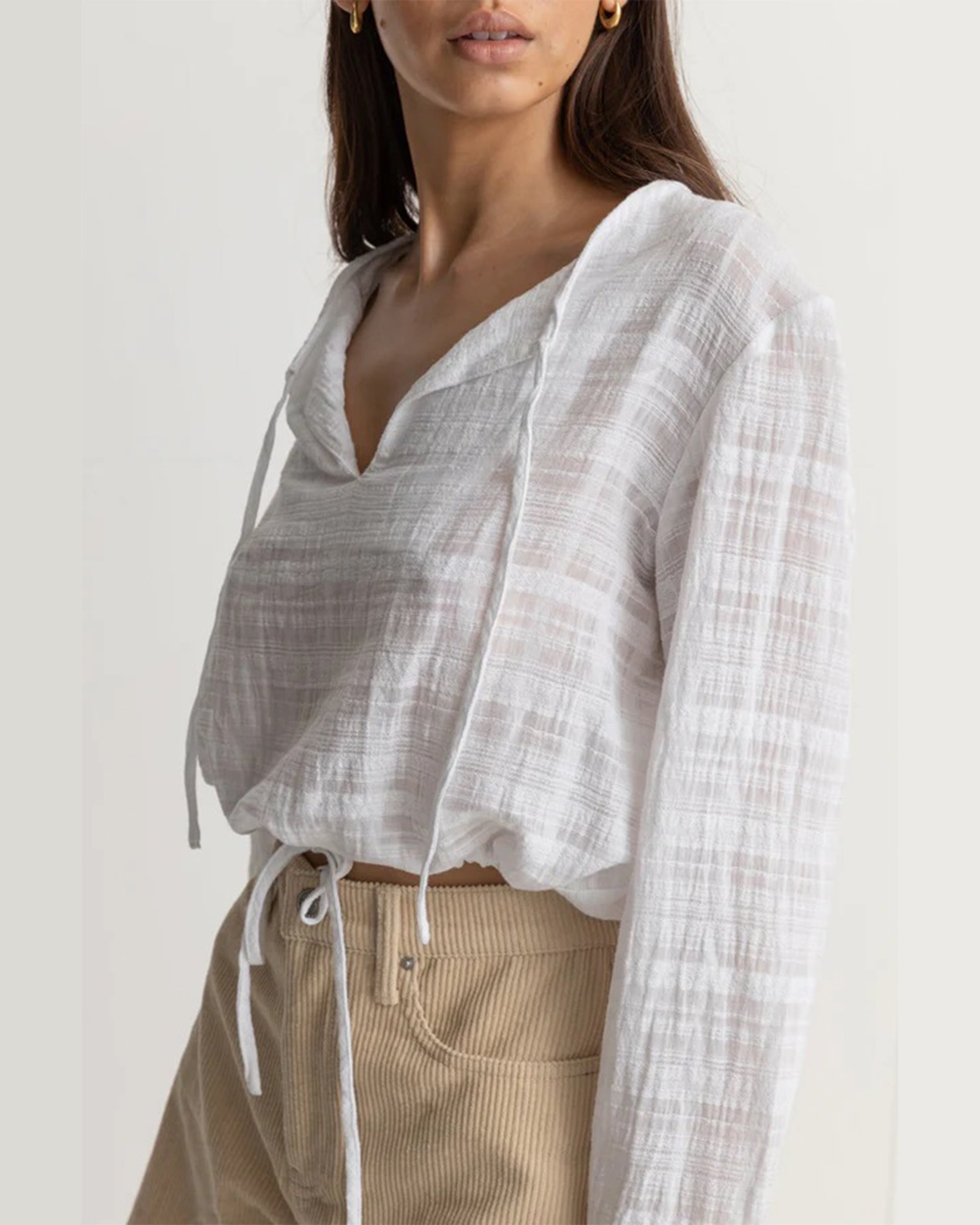 The Kiara Long Sleeve Top offers a feminine and breezy silhouette with its billowy sleeves and tie waist.