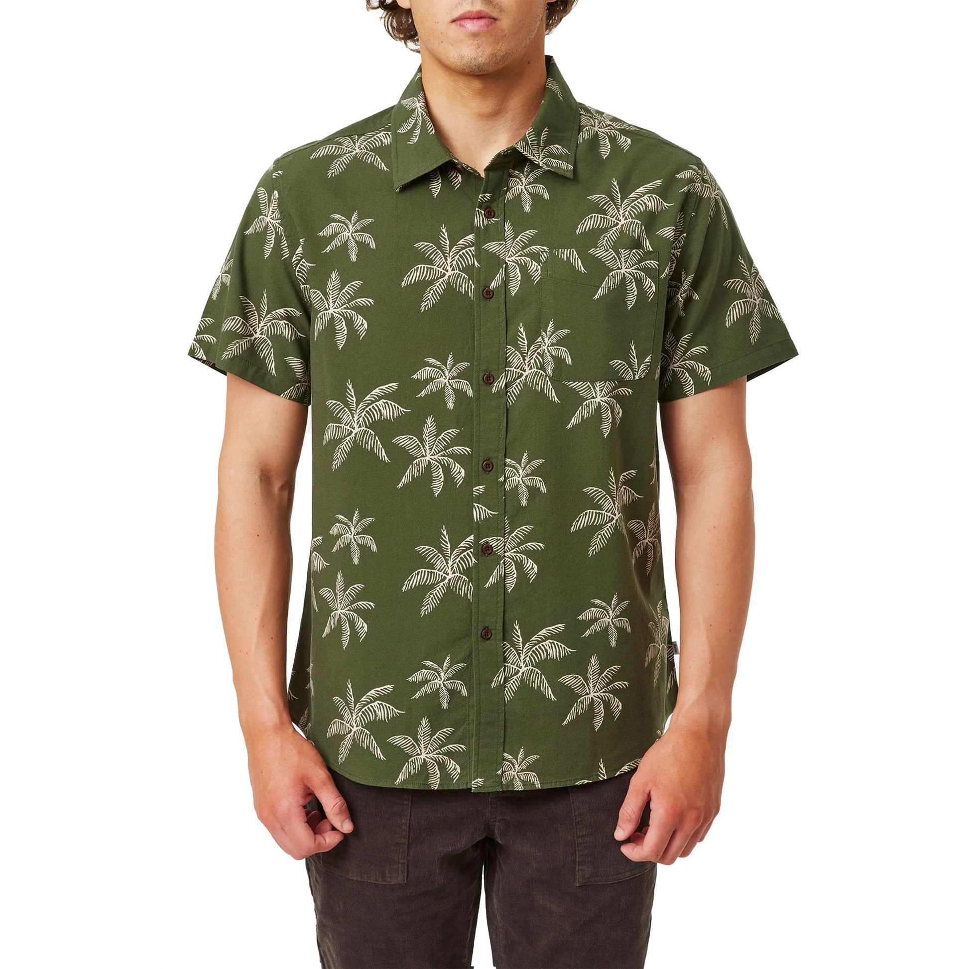 The Mai Tai Shirt features a custom palm print atop a breathable cotton/linen button-up woven shirt.