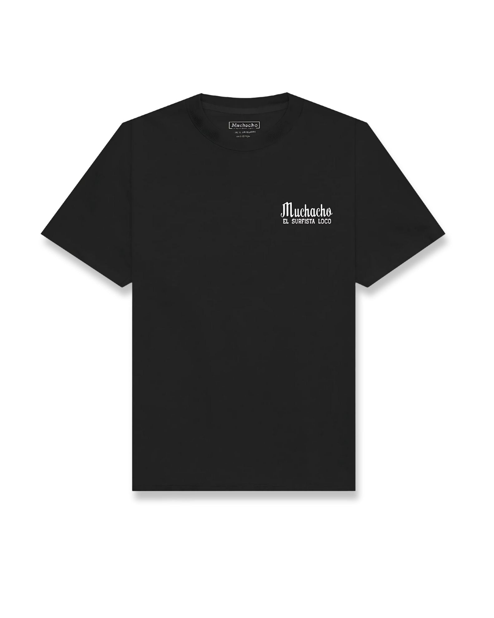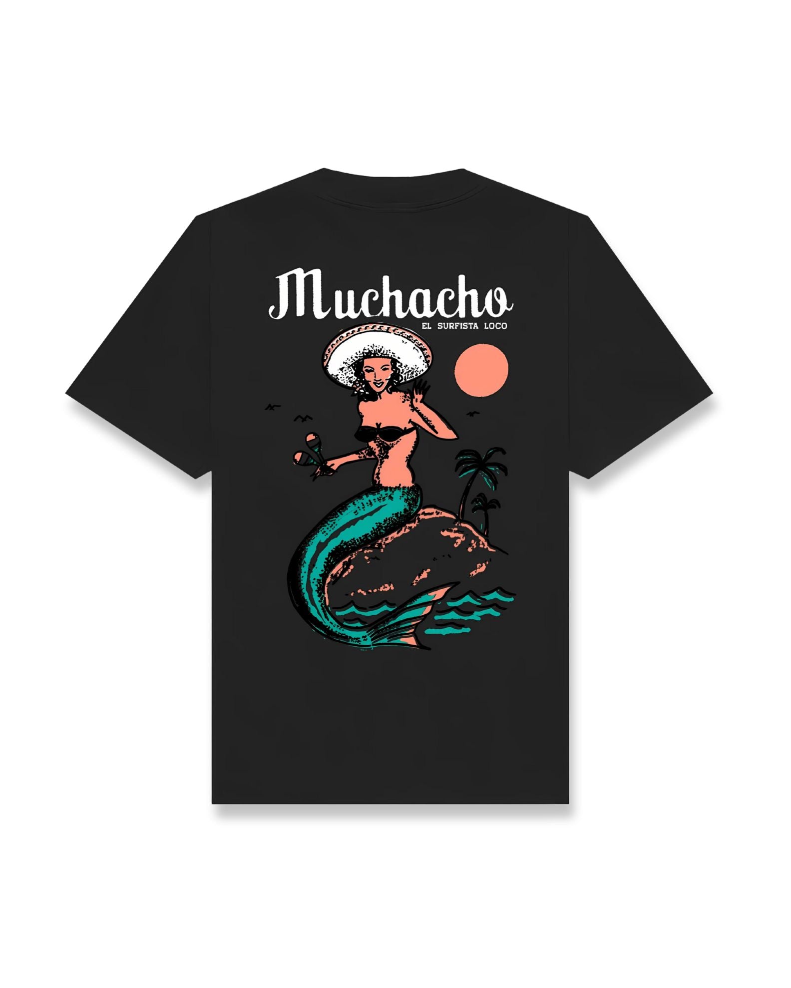 This playful Mermaid S/S T-Shirt features a classic width and rib collar for comfortable wear. Its seamless body ensures a smooth fit, while the large back graphic showcases a whimsical mermaid wearing a sombrero, holding maracas against a sunset and palm tree backdrop. The front left chest sports a smaller print of "Muchacho El Surfista Loco," adding a fun, beachy vibe perfect for surf lovers and sun seekers alike.