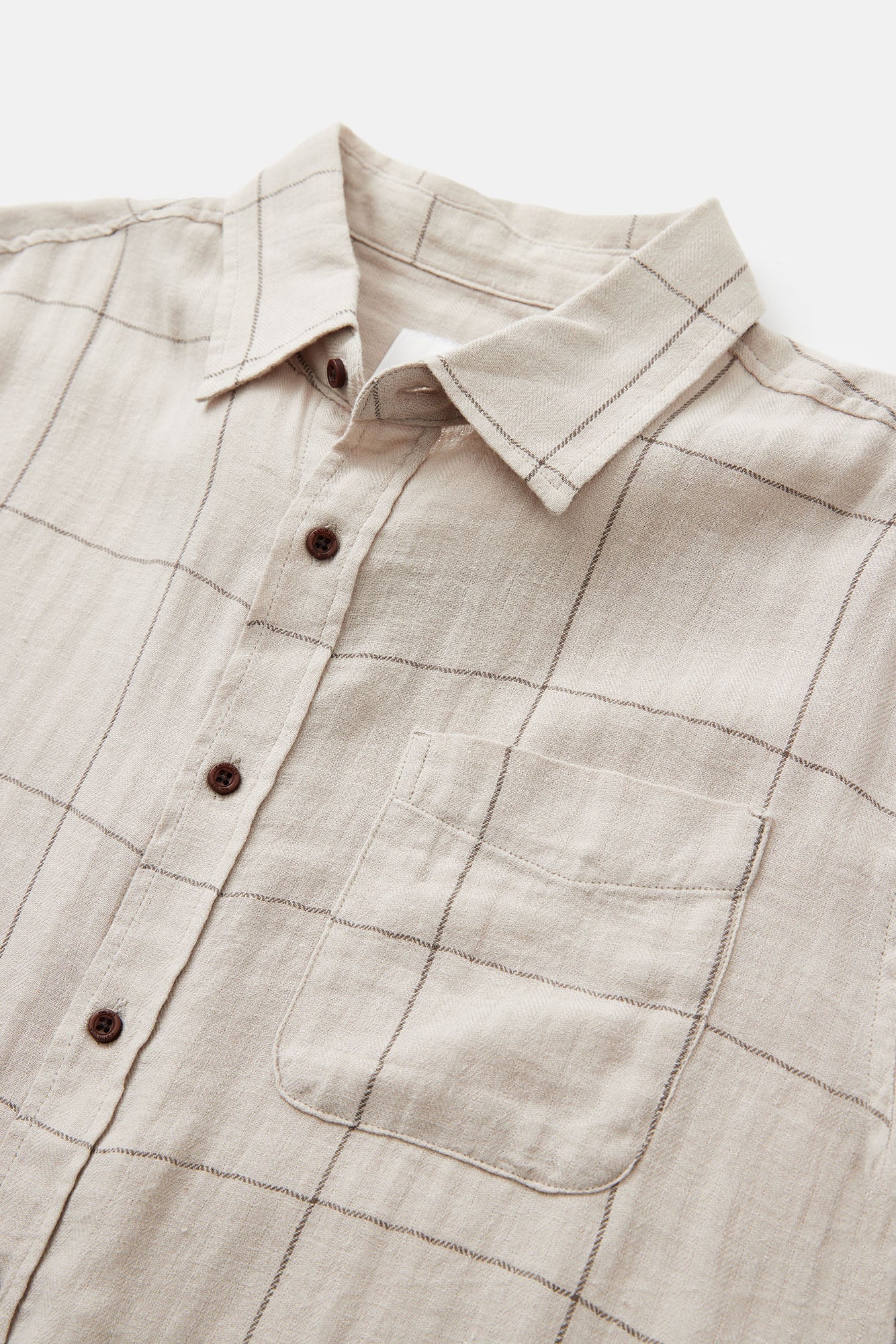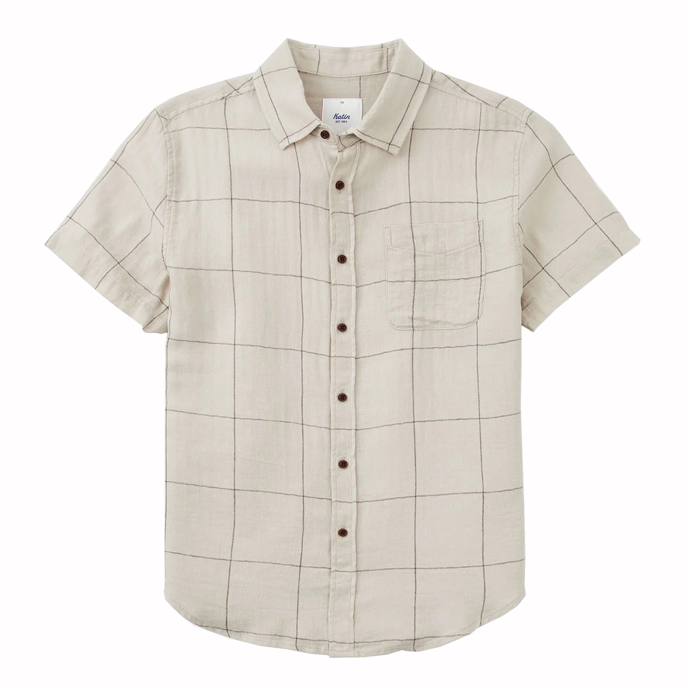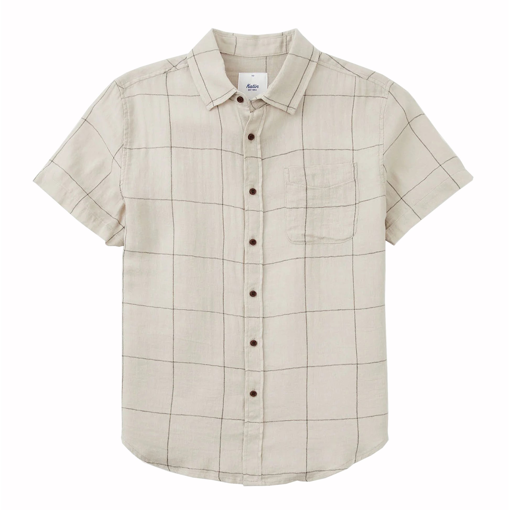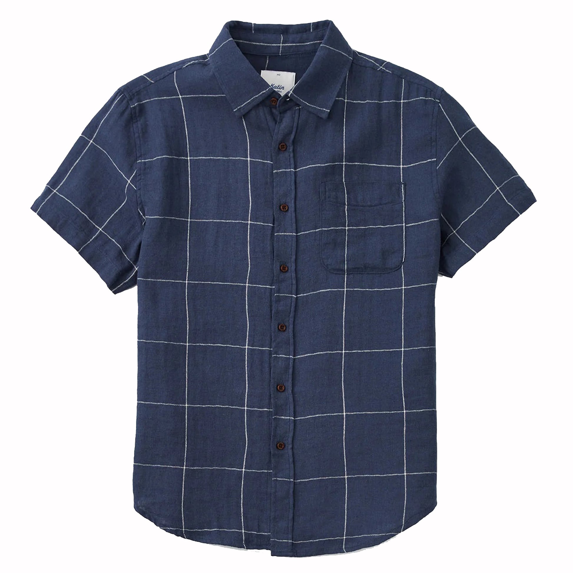 The Monty Shirt features a custom vintage-inspired checkered pattern atop a breathable cotton/linen button-up woven shirt.