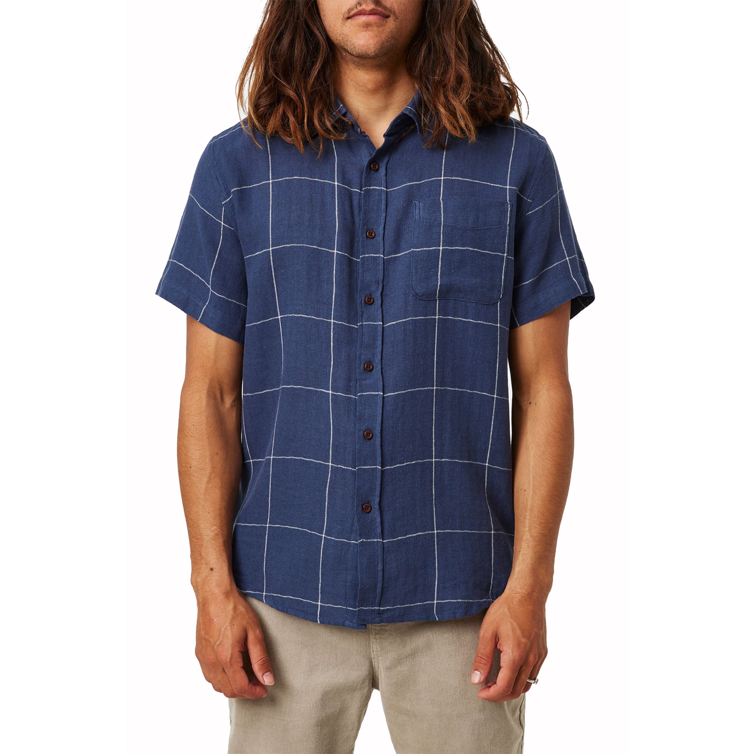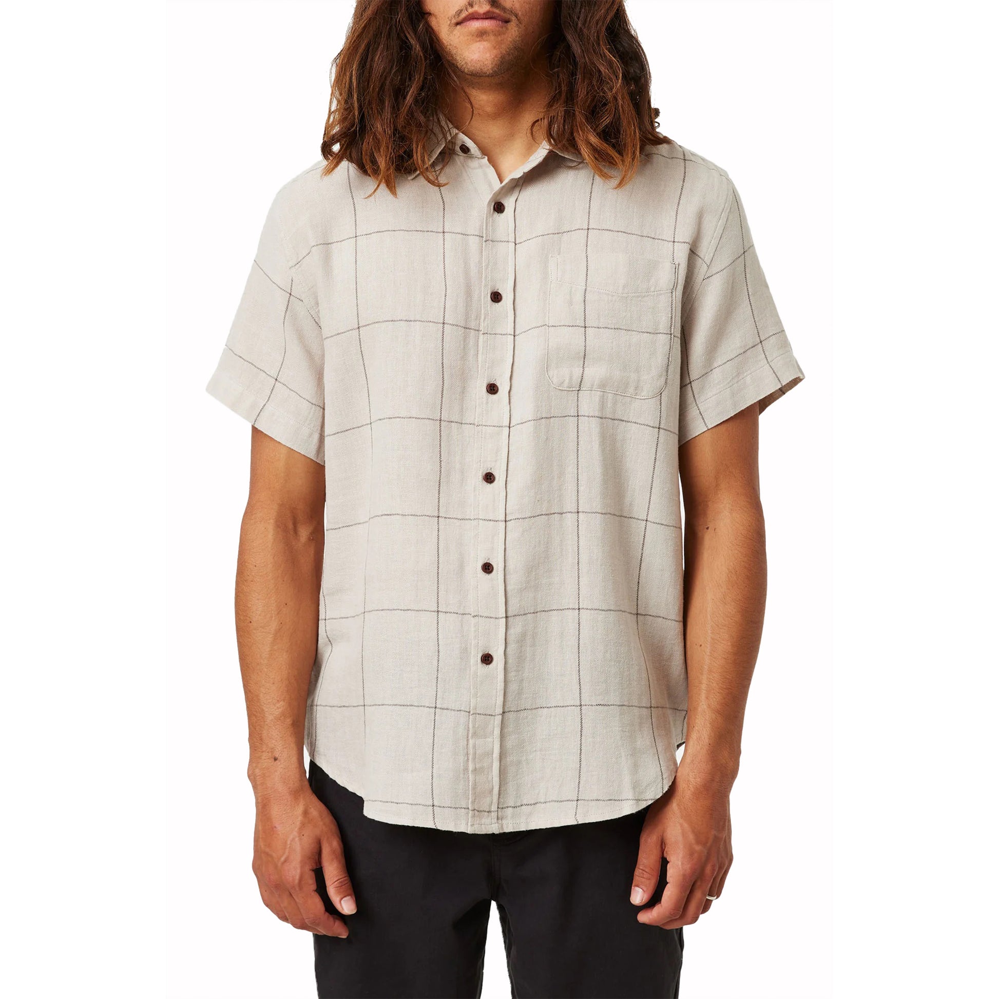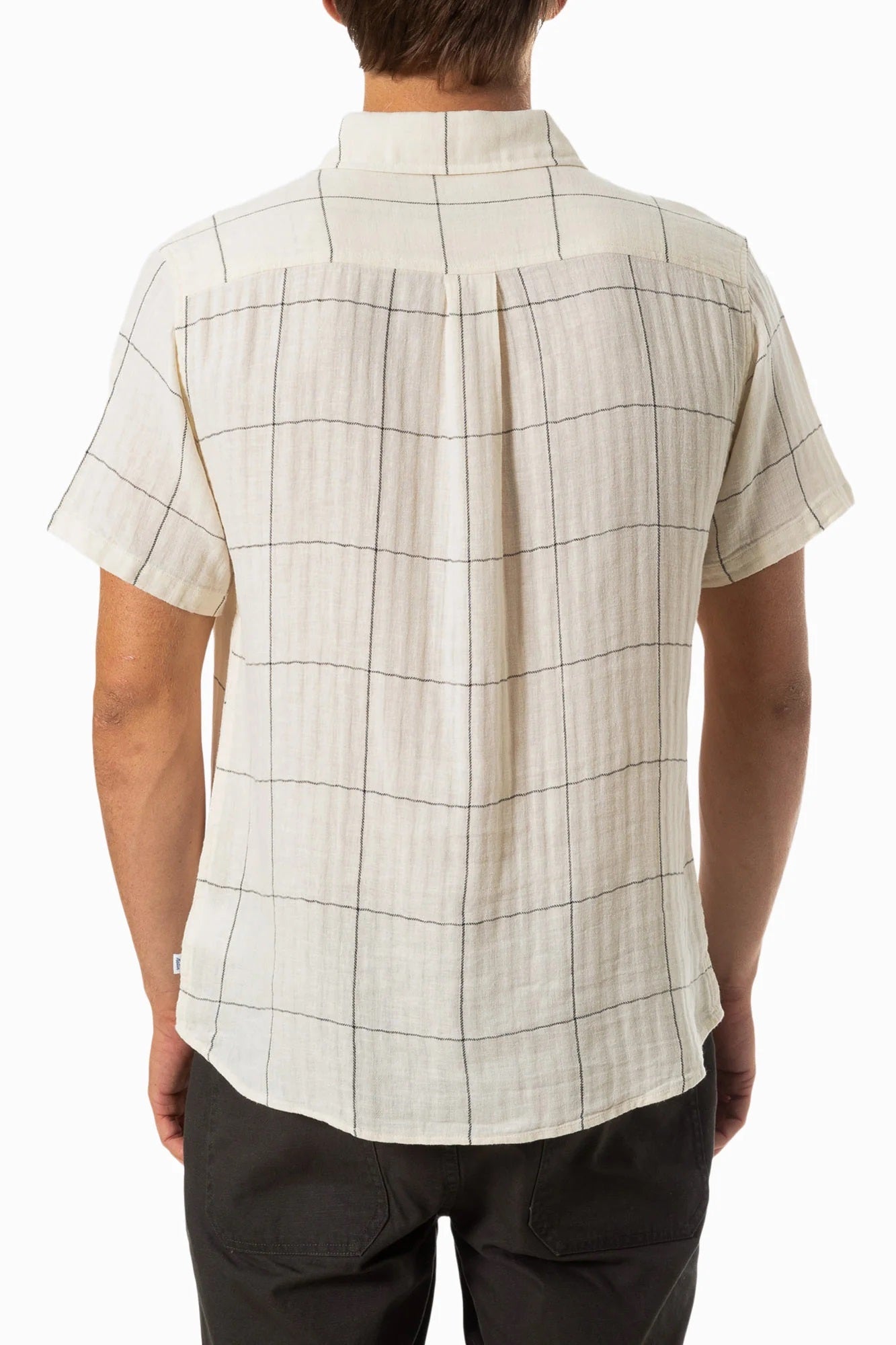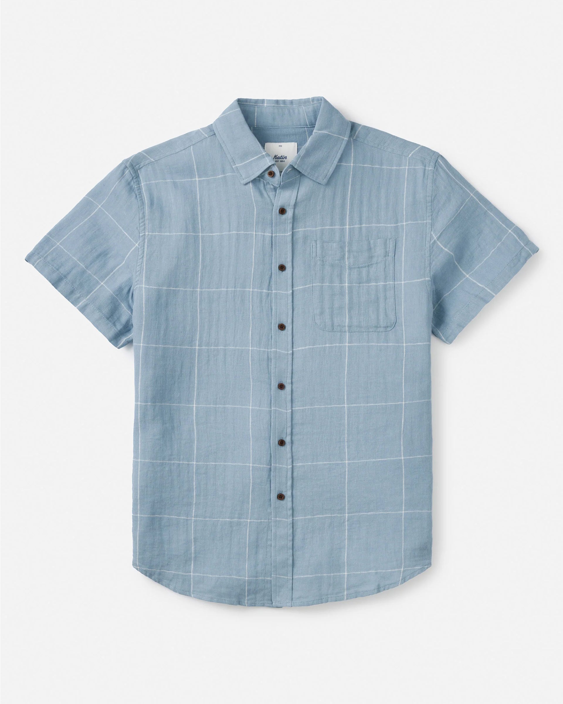 The Monty Shirt features a custom vintage-inspired checkered pattern atop a breathable cotton/linen button-up woven shirt.