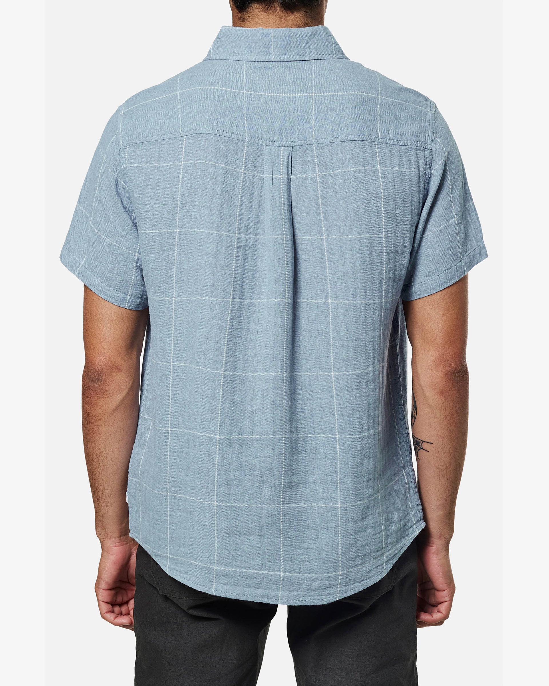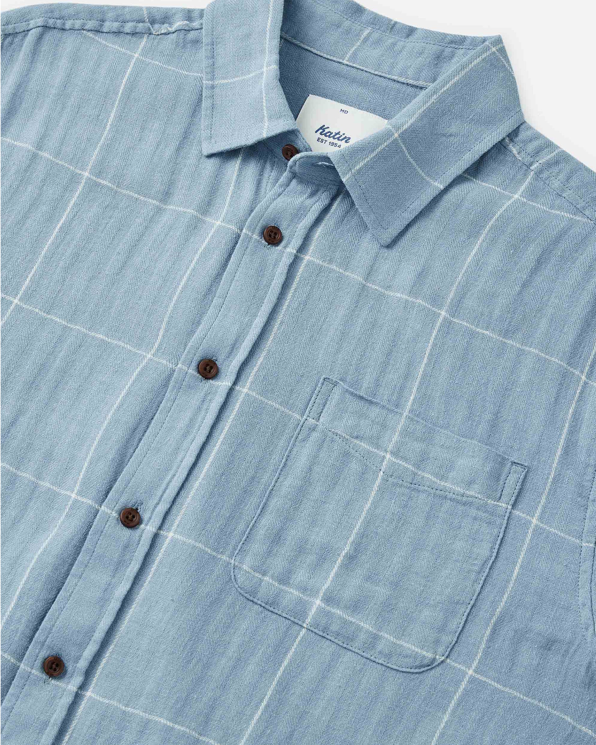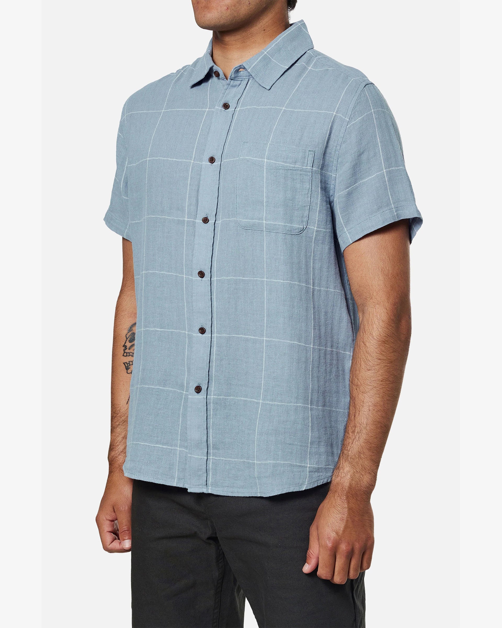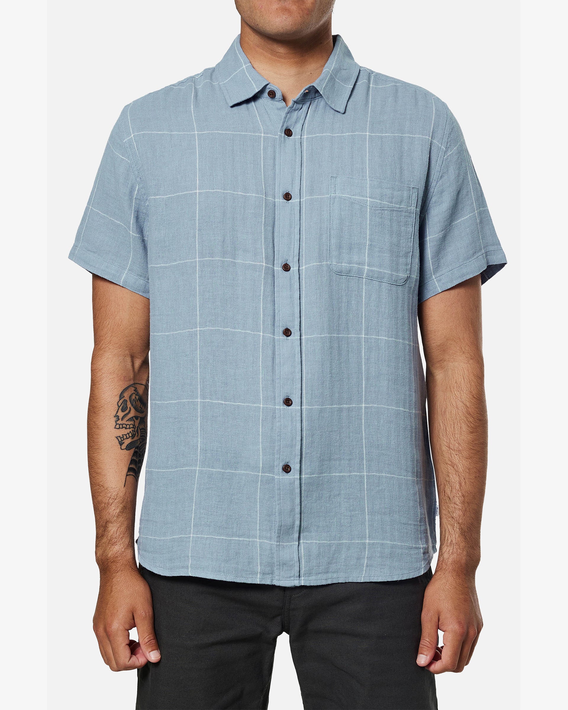 The Monty Shirt features a custom vintage-inspired checkered pattern atop a breathable cotton/linen button-up woven shirt.
