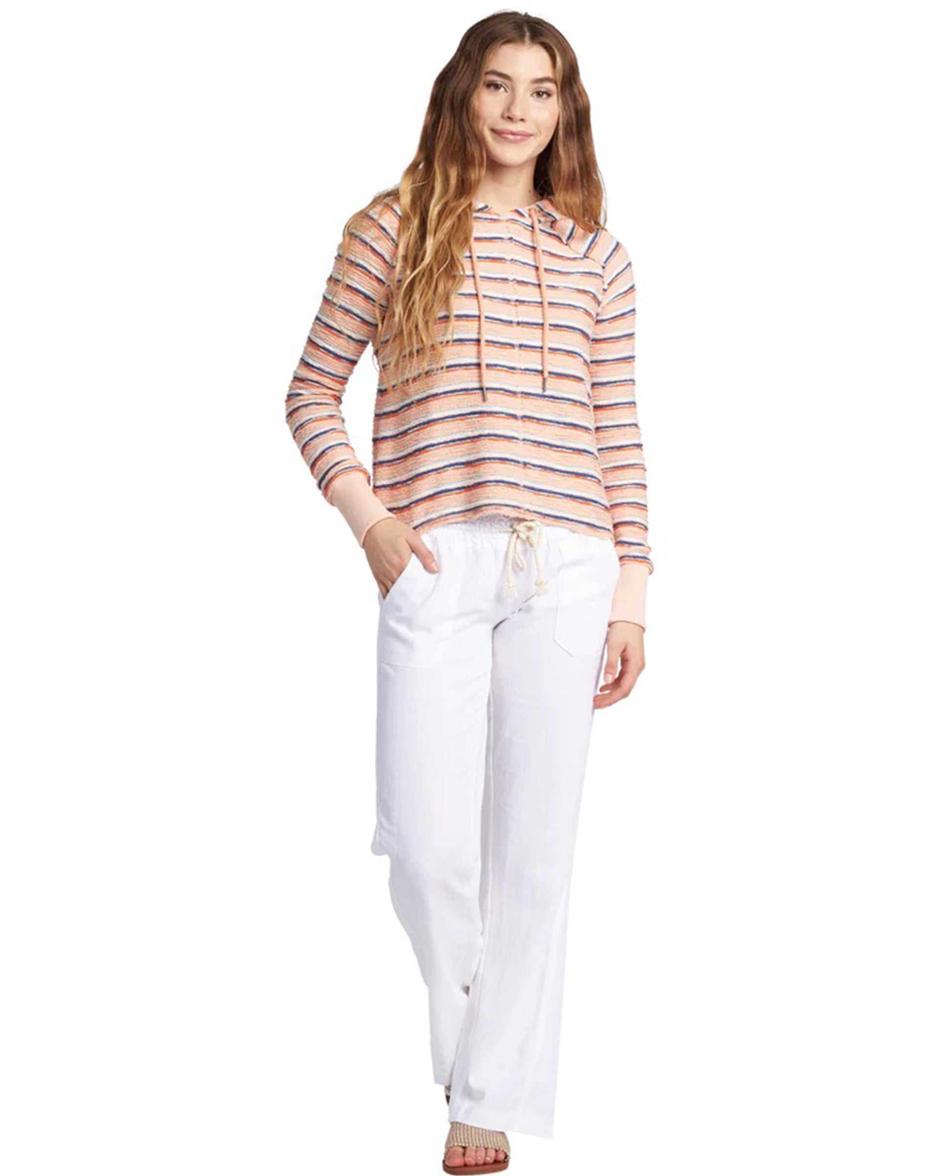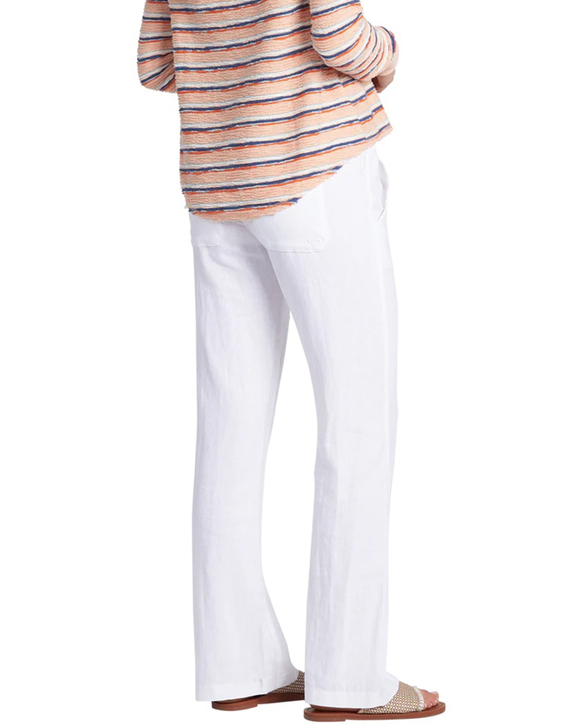 The Roxy Oceanside Beach Pant is a stylish and comfortable choice for warm-weather wear. These pants feature a flared leg design and are crafted from a breathable cotton-linen blend, ensuring comfort during hot days. They come with a jute rope belt and an elastic waistband for an adjustable fit. Additional details include front and back patch pockets, as well as a heart embroidery on the back right pocket, adding a touch of feminine flair.