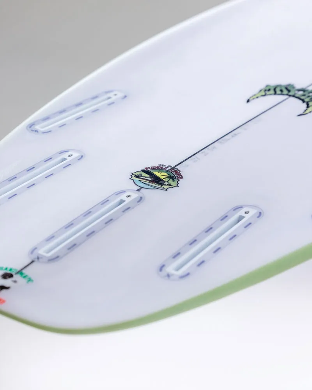 The Puddle Jumper is a con-caved, planing surfacer speeder. Domestic bliss with a twist. Based off the outline of the Bottom Feeder, but with reversed bottom and rocker curves. This board, unlike the past Domestic models (like The Bottom Feeder and RV) features a concave bottom that transitions to vee in the tail. The wide outline makes for easy wave catching and down the line glide and stability. The concave bottom adds lift and increased rail curve, which allows radical top to bottom surfing. The straight rail line and vee in the tail keep the board moving forward and hold in during hard carving maneuvers. “This is the most excited I have ever been about a small wave surfboard. Personally, it’s the best small wave board I have ever ridden. I have never made a claim like that about any board before”