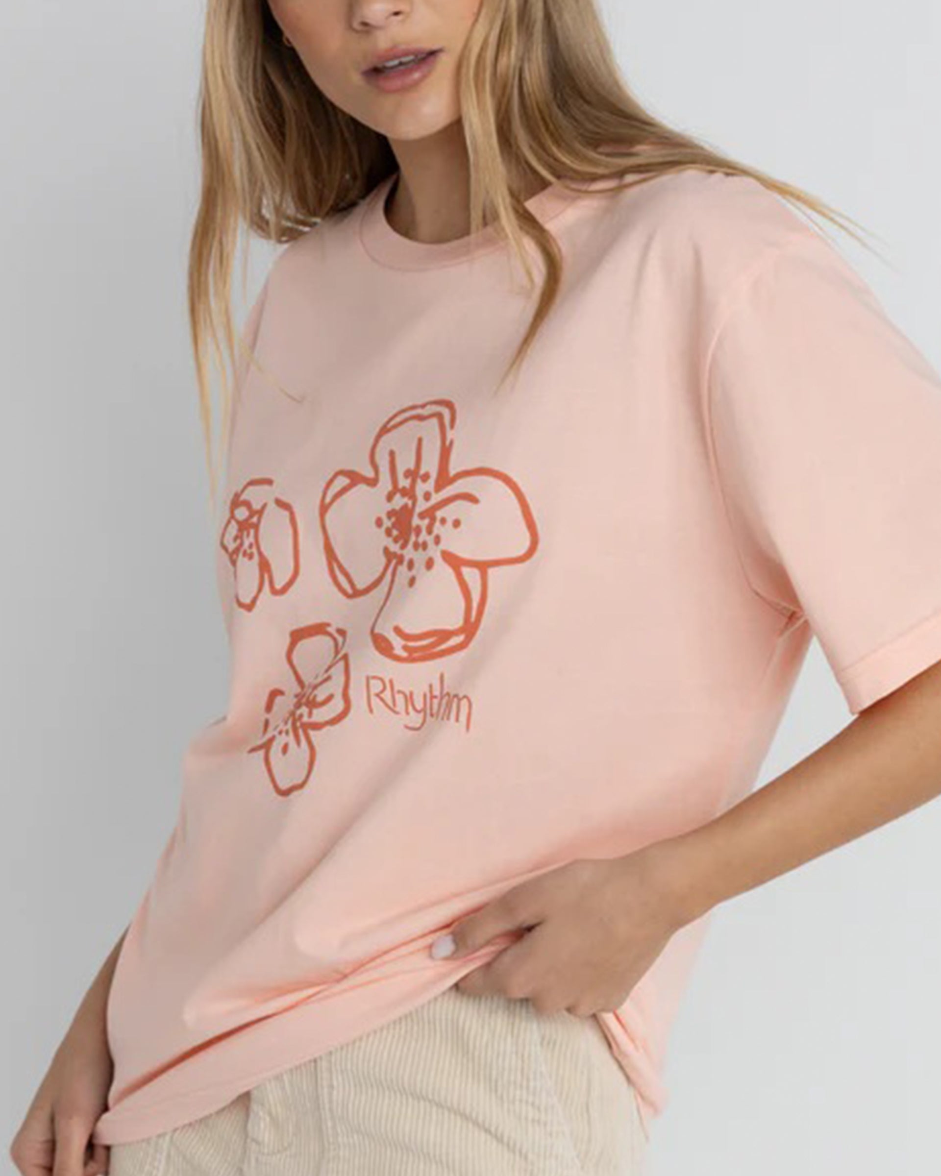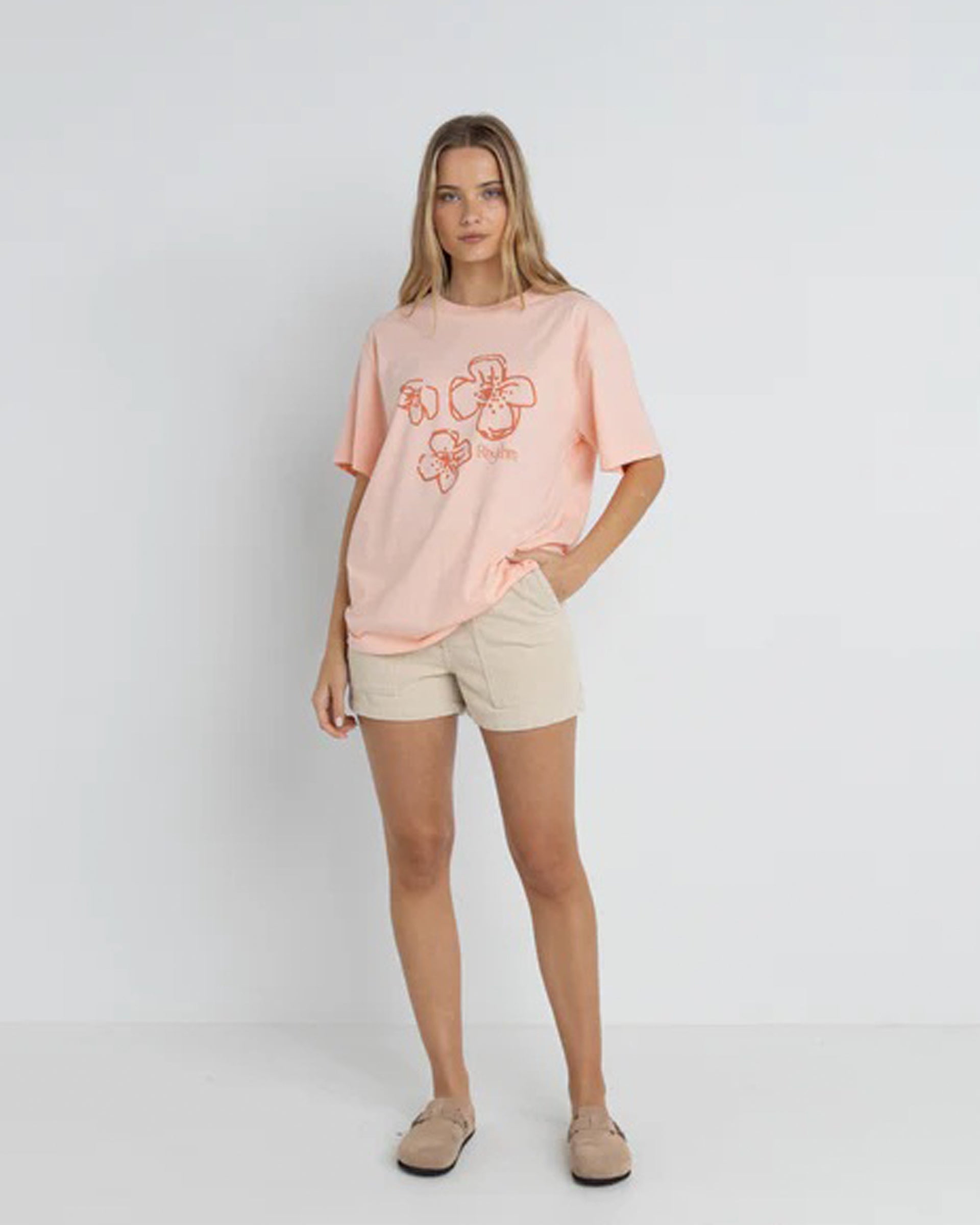 The Paradise Floral Oversized T-Shirt in Pink combines lighthearted flair with a modern cut. Made from 100% cotton jersey, it features an oversized relaxed silhouette, round crew neck, and elbow-length short sleeves. With a custom hand-drawn Rhythm print in water-based ink, it perfectly captures a more creative life by the coast.