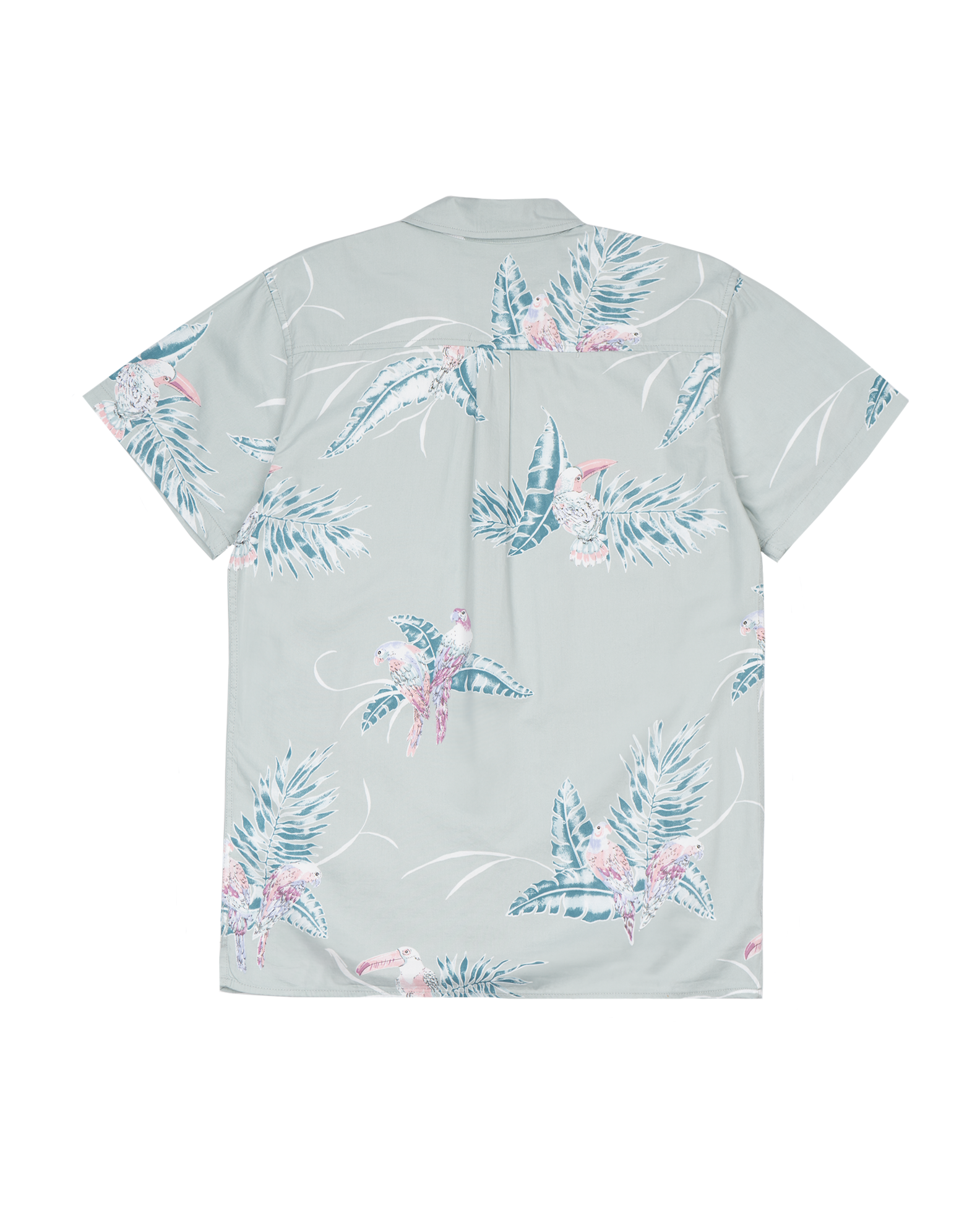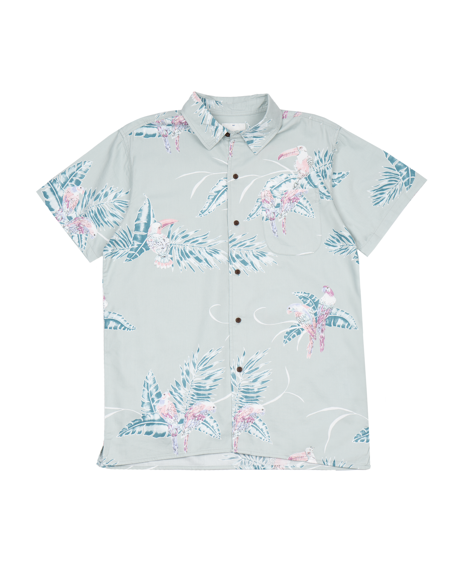 Katin Paradise tropical print short sleeve button-down shirt. Lightweight button-down shirt from Katin in a breathable weave with an allover tropical print. Short sleeve in a regular fit with a pocket at the chest. Finished with a straight cut hem.