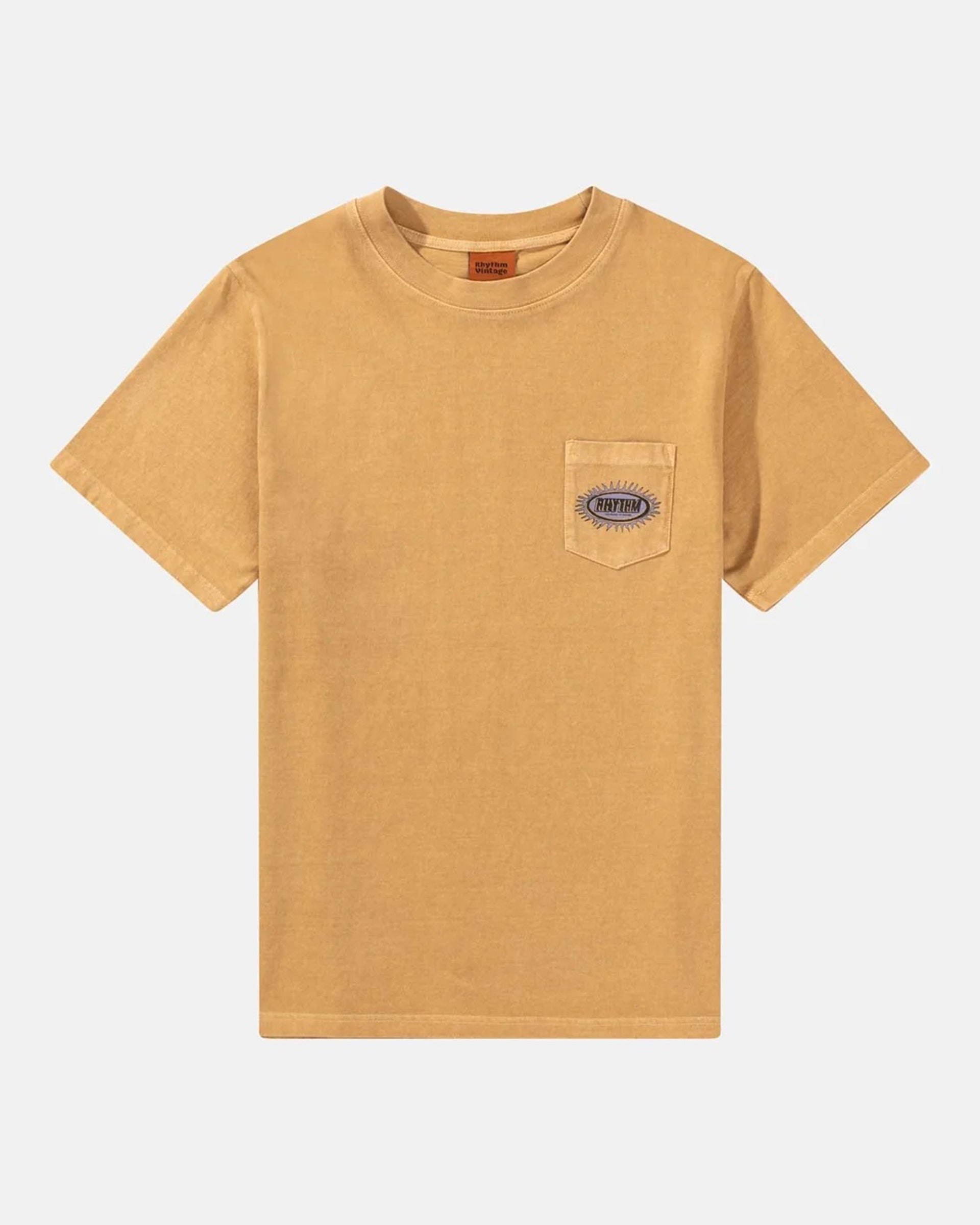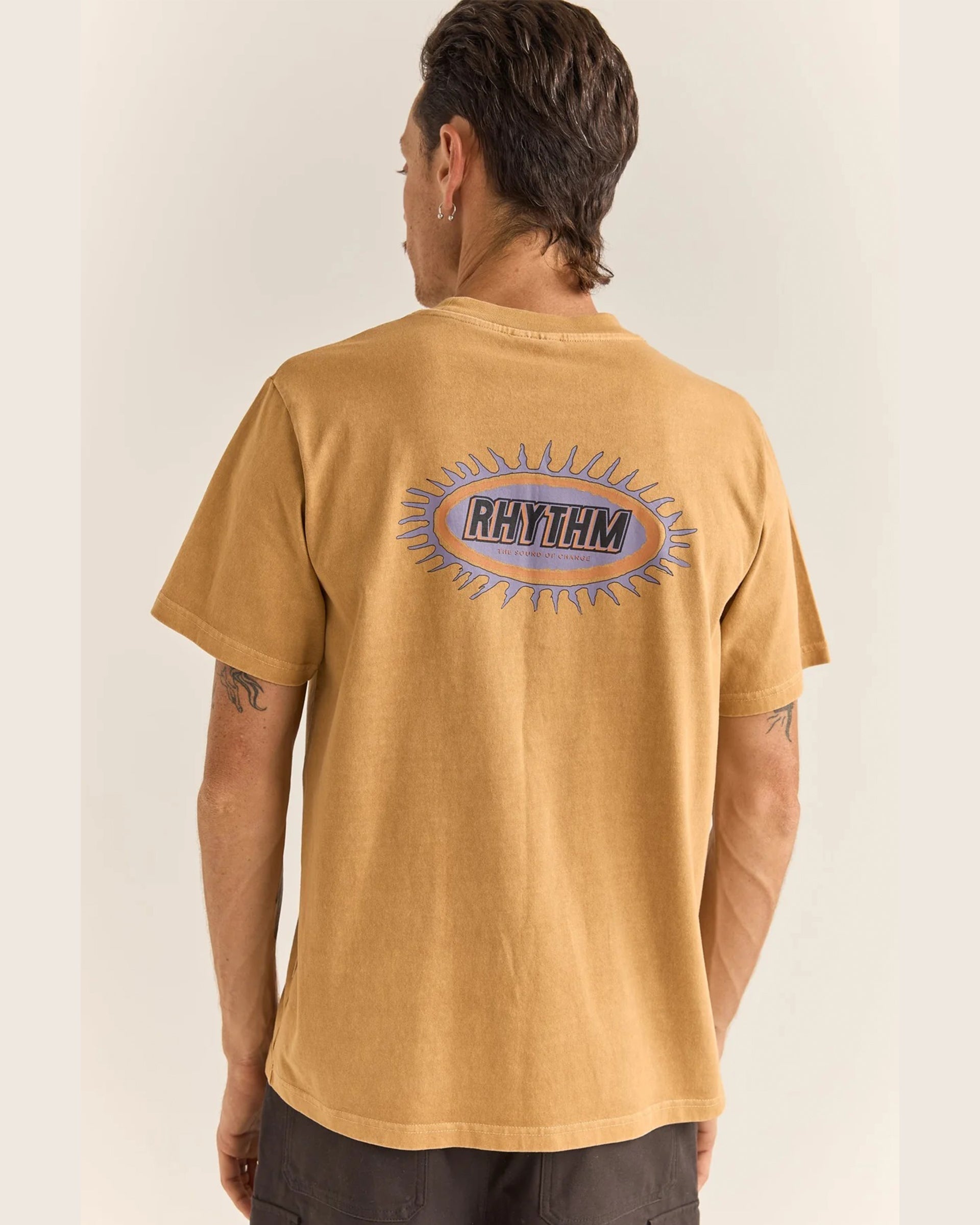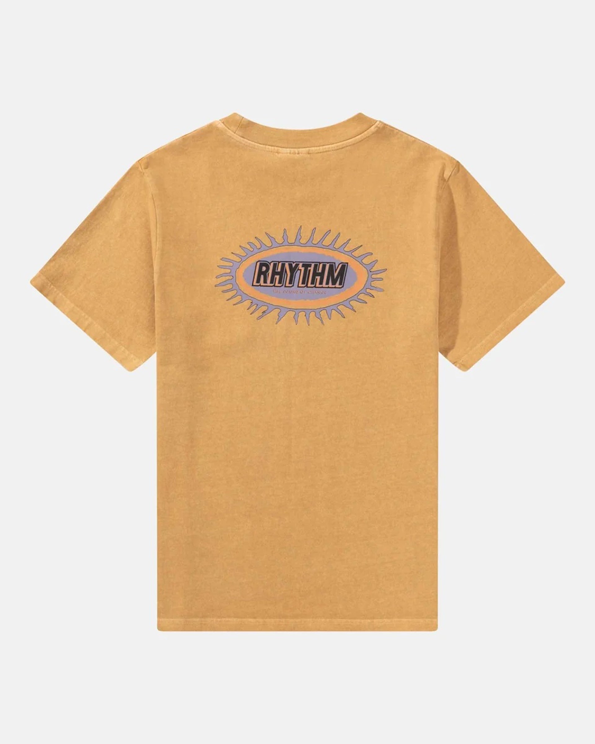 The Rays Vintage SS T-shirt is a staple Rhythm silhouette made with a washedand dyed for a vintage hand feel. With it's cracked ink-screen print artwork, the Swirl Vintage SS T-shirt features graphic reminiscent of nostalgic Y2K vibe. Made from 100% Cotton with a classic 1x1 ribbed collar.