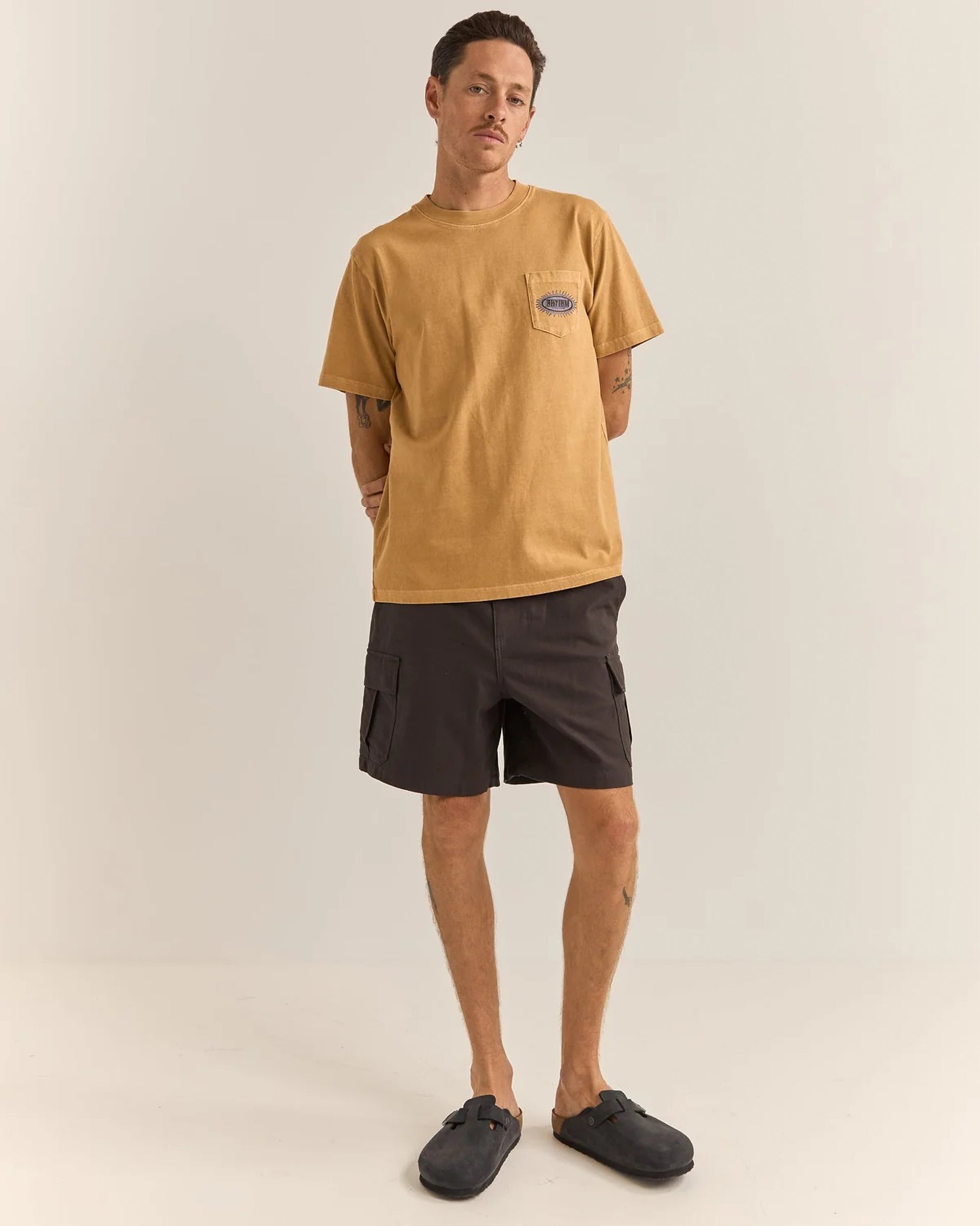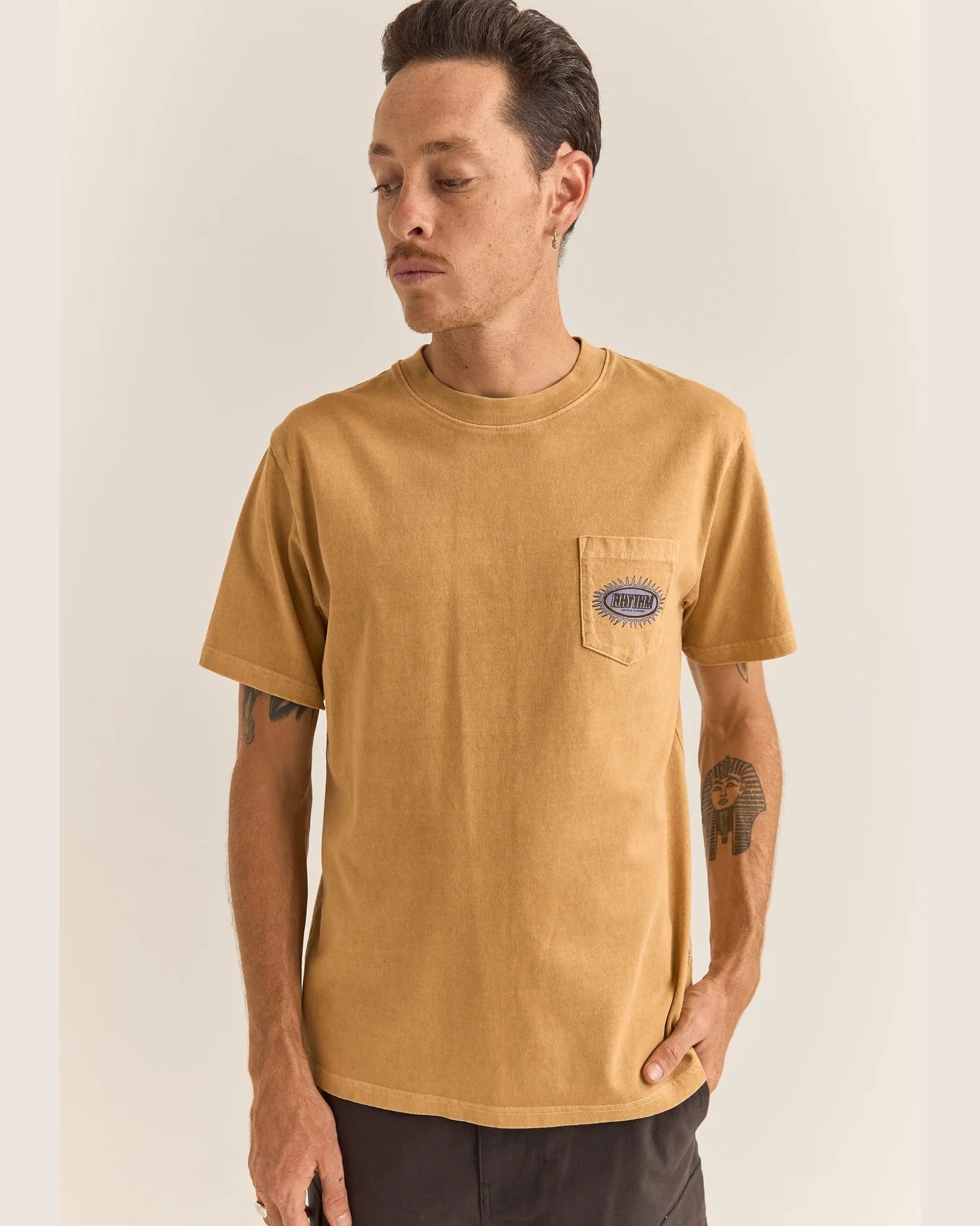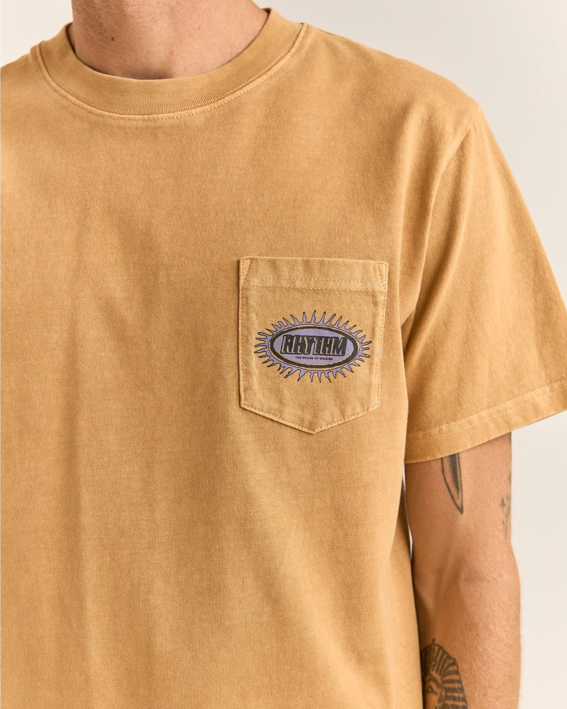 The Rays Vintage SS T-shirt is a staple Rhythm silhouette made with a washedand dyed for a vintage hand feel. With it's cracked ink-screen print artwork, the Swirl Vintage SS T-shirt features graphic reminiscent of nostalgic Y2K vibe. Made from 100% Cotton with a classic 1x1 ribbed collar.
