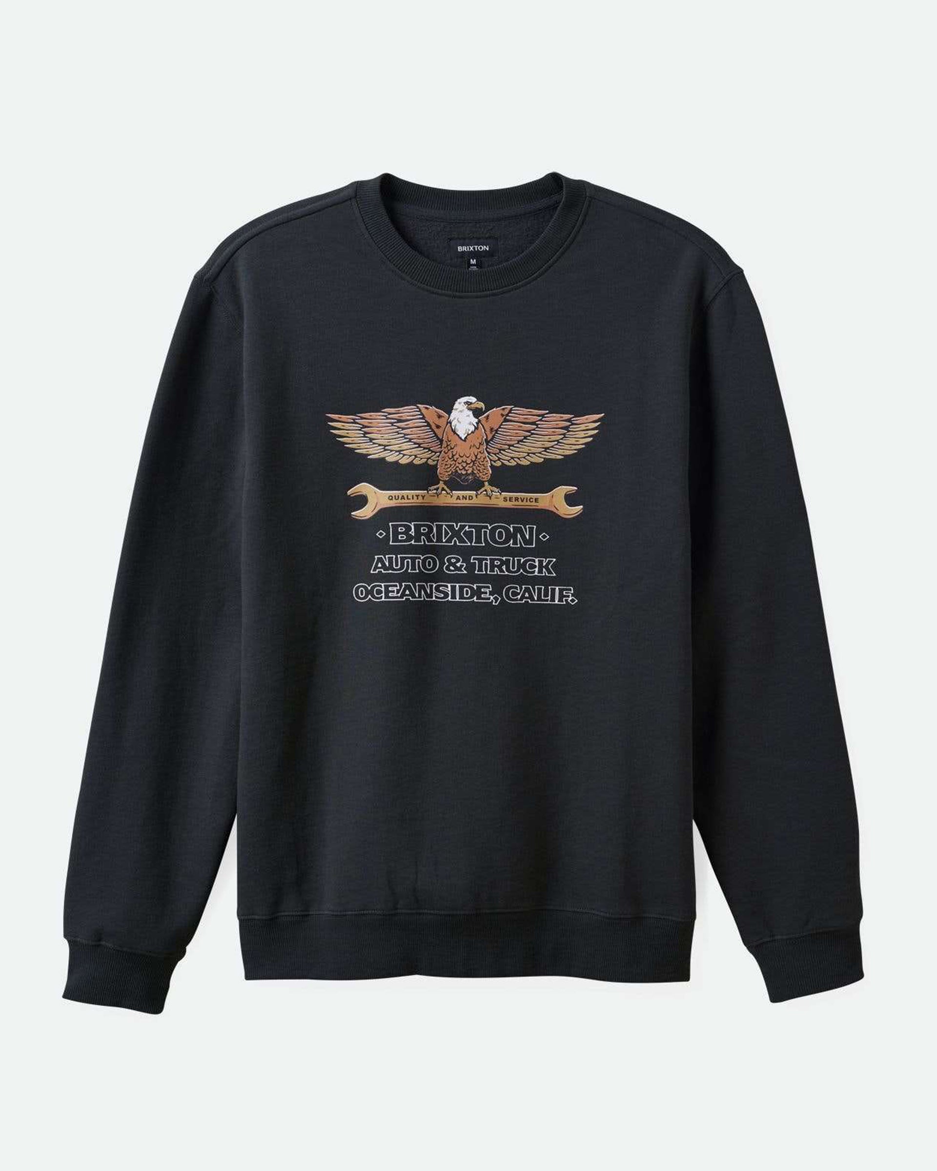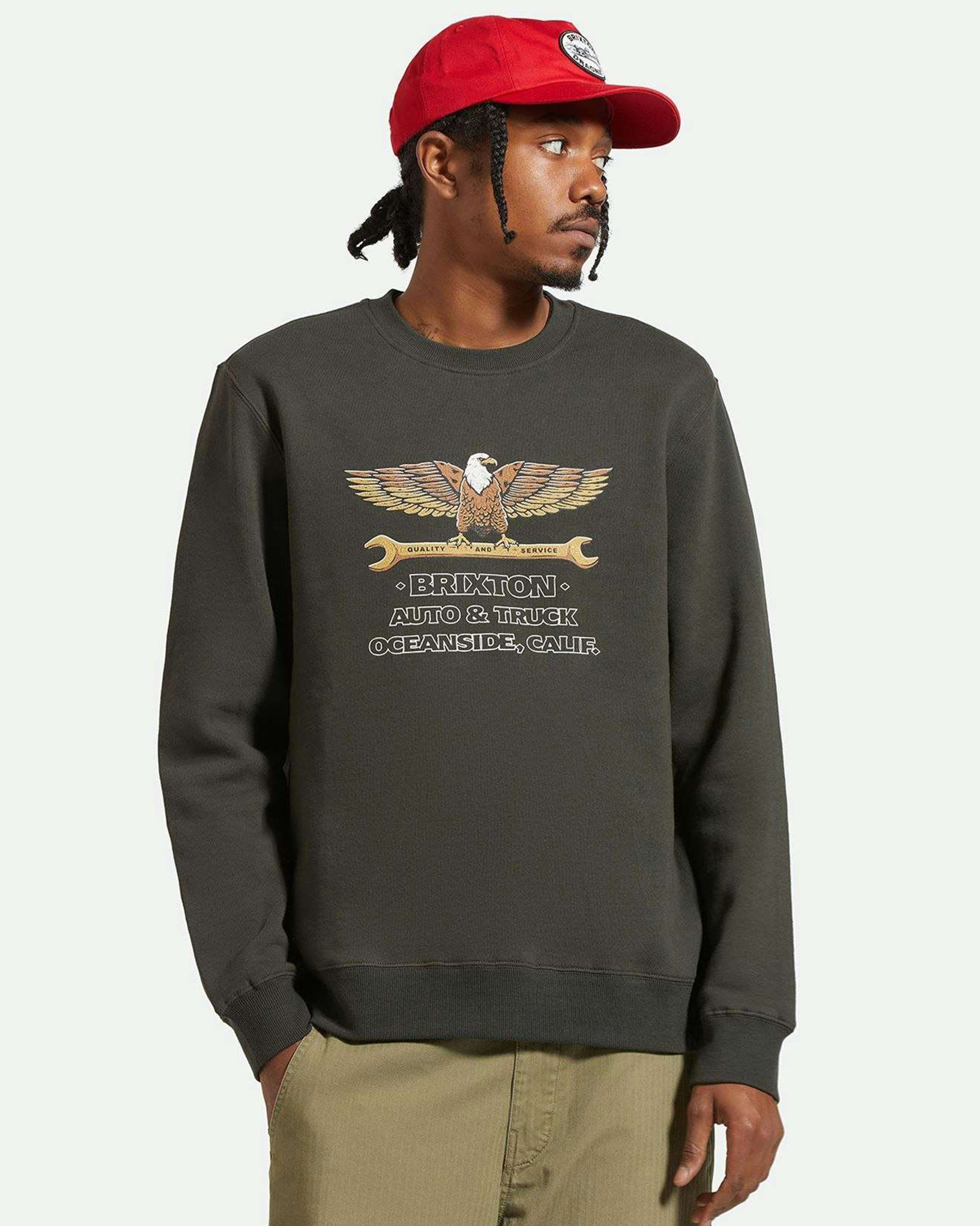 This crew neck sweatshirt brings a relaxed vibe with its medium-weight recycled fleece fabric and unique crackle print design featuring an eagle & wrench motif across the front. With its casual crew neckline and inset sleeves, it's a perfect layer for kicking back or hitting the streets—the best of both worlds. Brixton's workwear-inspired threads fuse rugged utilitarianism with a modern urban aesthetic, making this crew neck sweatshirt an essential closet staple for those who appreciate quality comfort without sacrificing style.