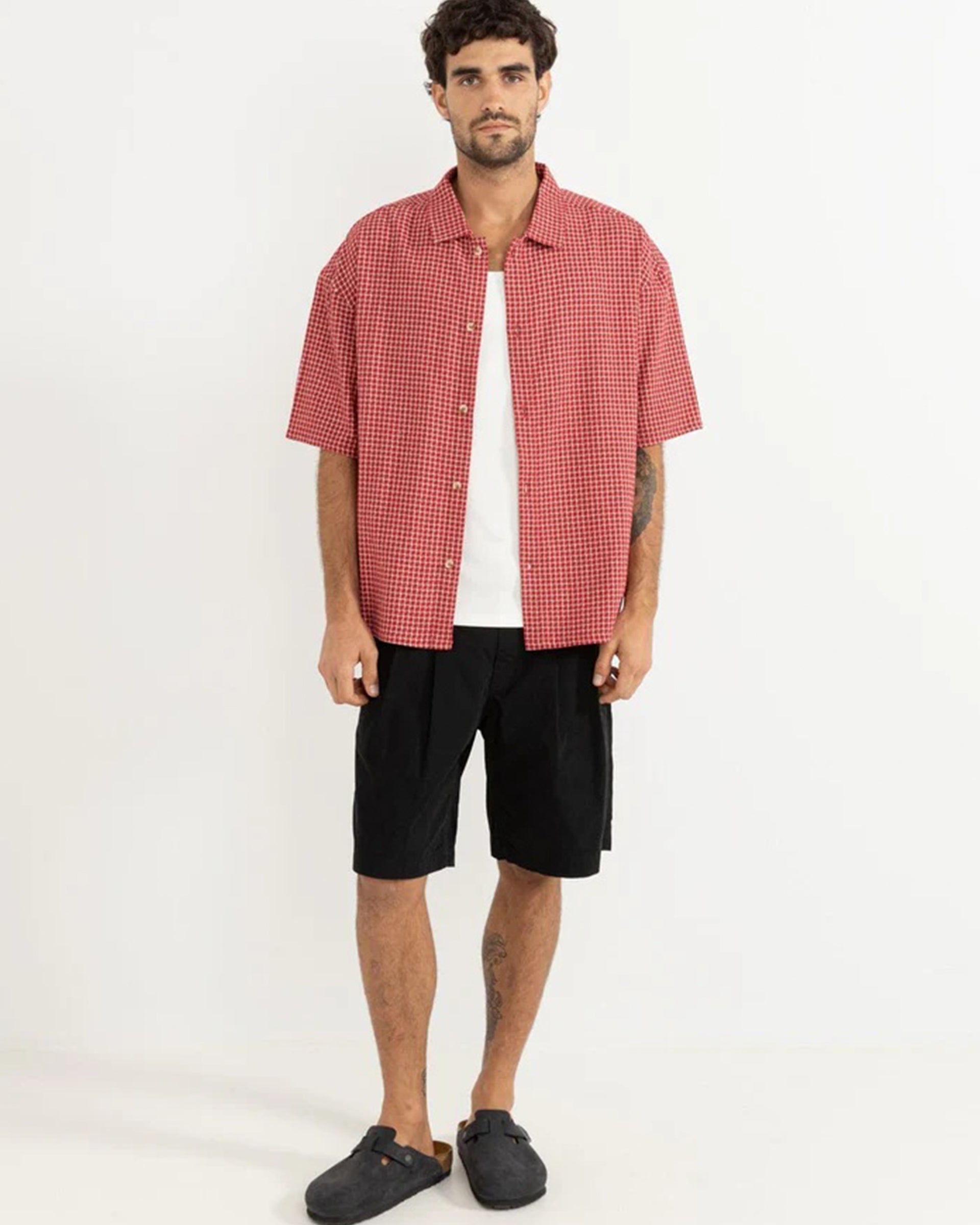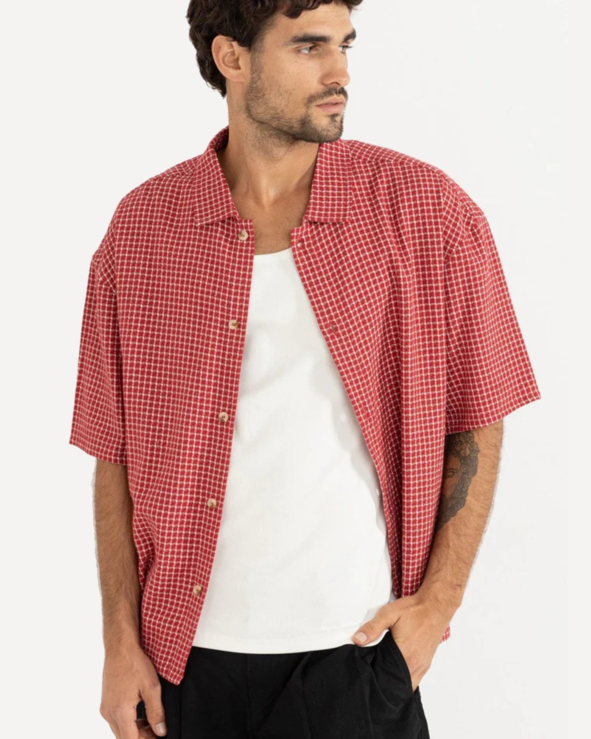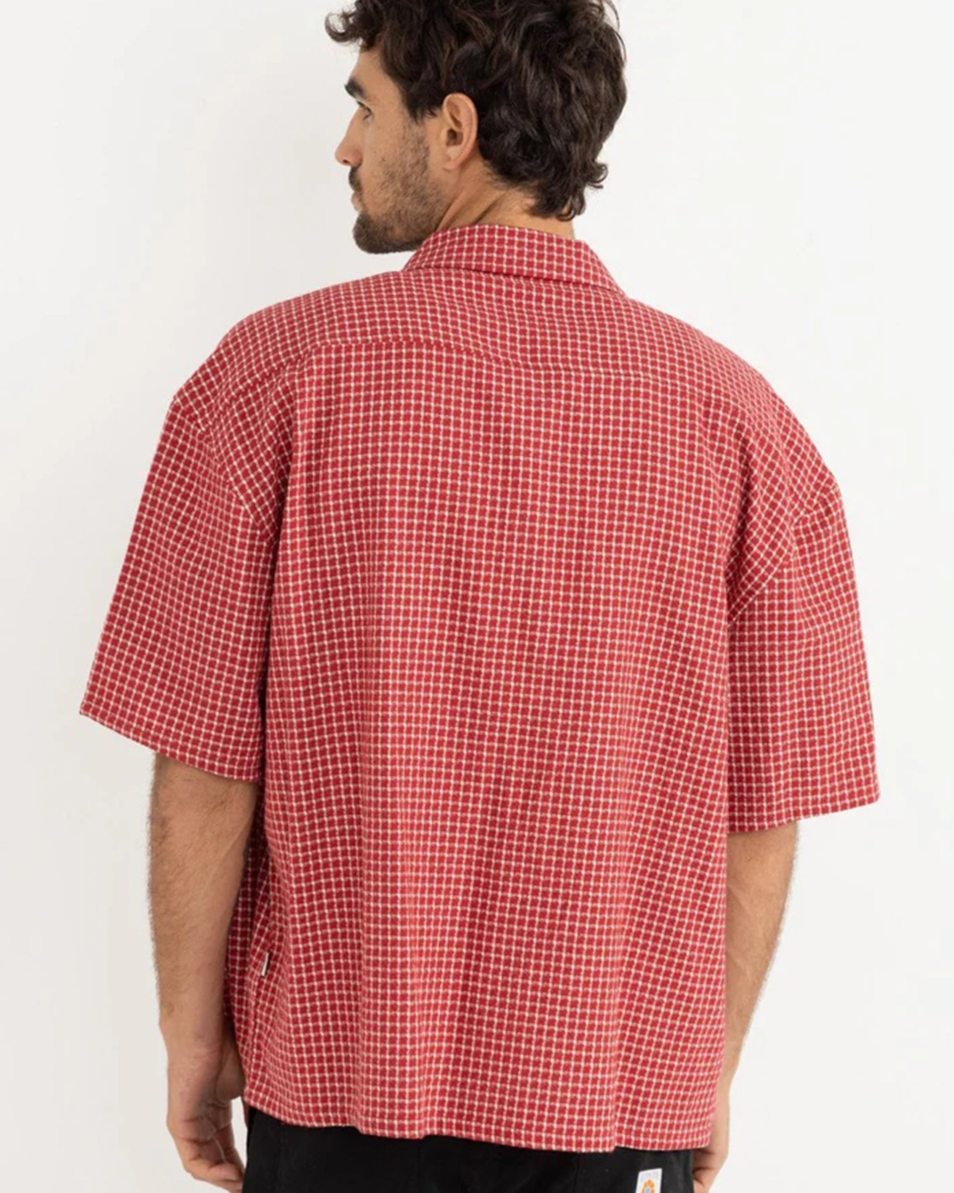 The Rowen Check SS Shirt in Red adds a touch of pattern to your wardrobe. Designed with a one-piece collar, button-front closure, and a straight hem, it’s finished with Rhythm labels and trims for a signature look.