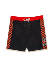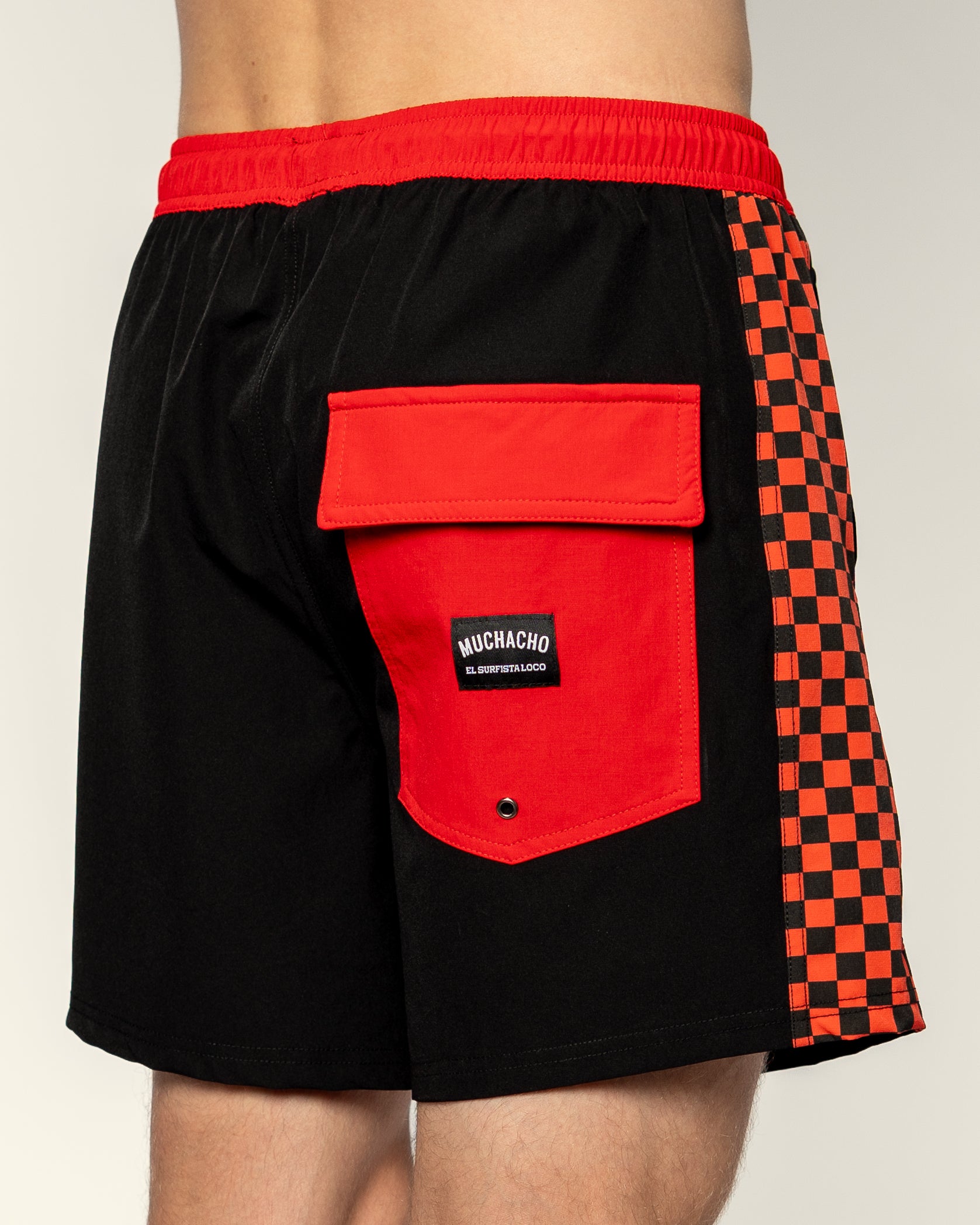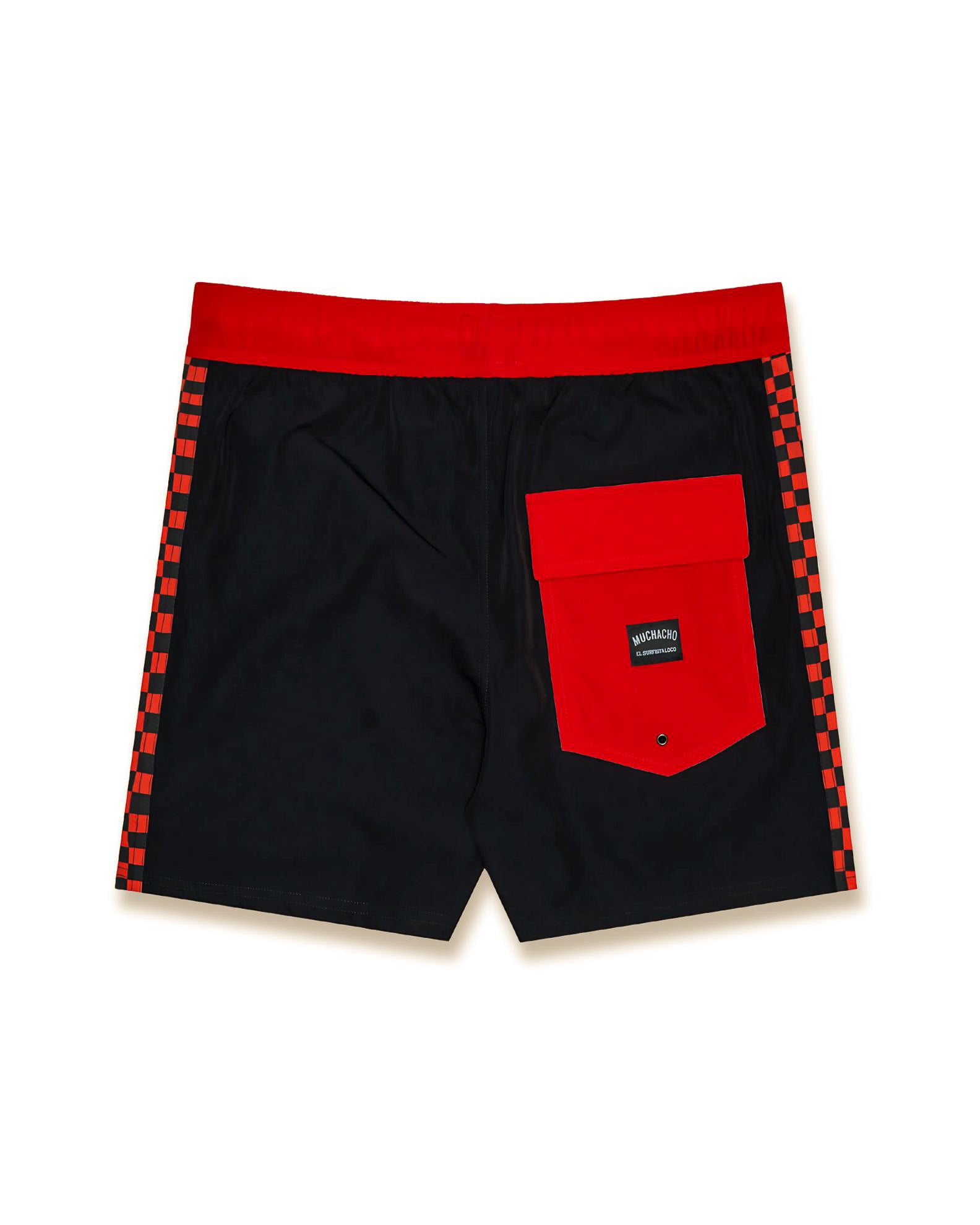 Bring a splash of fun to your beach days with the Sleepy 15" Volley Short in Black, featuring black & red checkered side panels that brighten up your look. The Muchacho oval patch on the left leg adds a cool, authentic touch. Perfect for surfing, swimming, or just lounging in style.