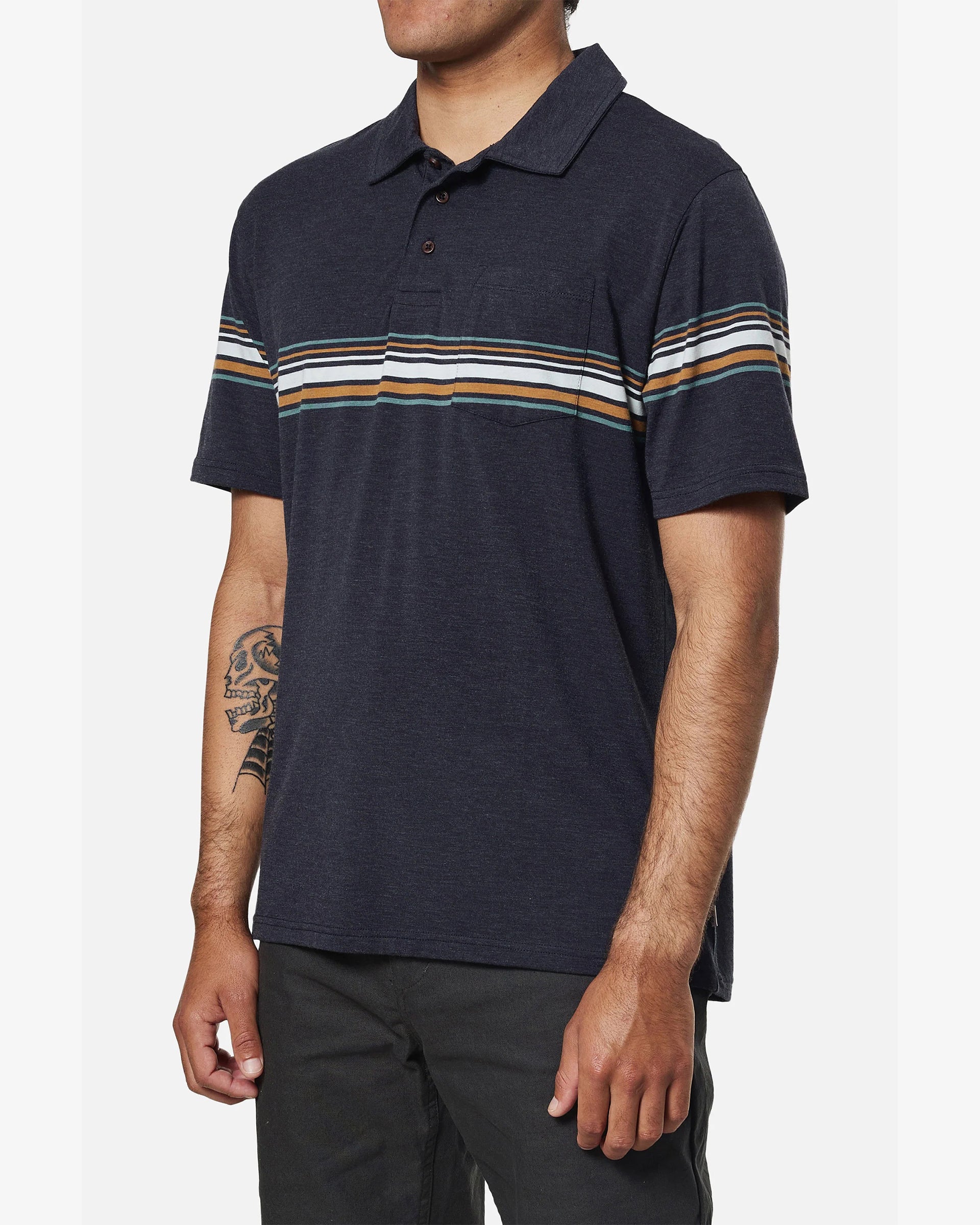 The Stacy Stripe Polo draws inspiration from the 70's skate scene and is crafted using a combination of Pima Cotton. It showcases a unique stripe pattern and includes a three-button placket and collar.