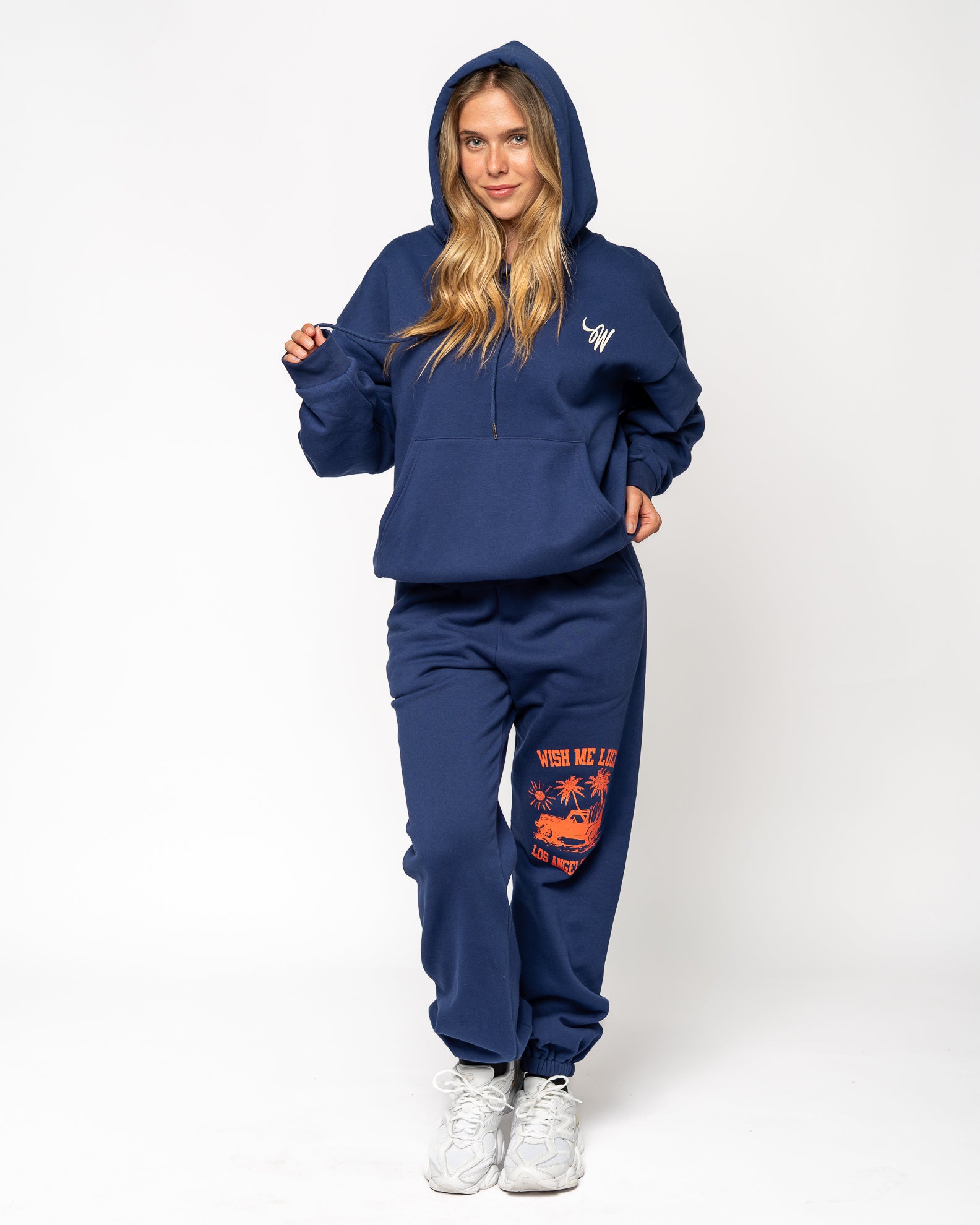 Stay cozy and cool in the Sunny Ride Pullover Hoodie. Made from 100% soft cotton, it features handy kangaroo pockets and a vibrant large orange Jeep with palm trees print on the back—perfect for adding a splash of adventure to your day. This blue hoodie brings playful vibes and comfort together for your next sunny outing.