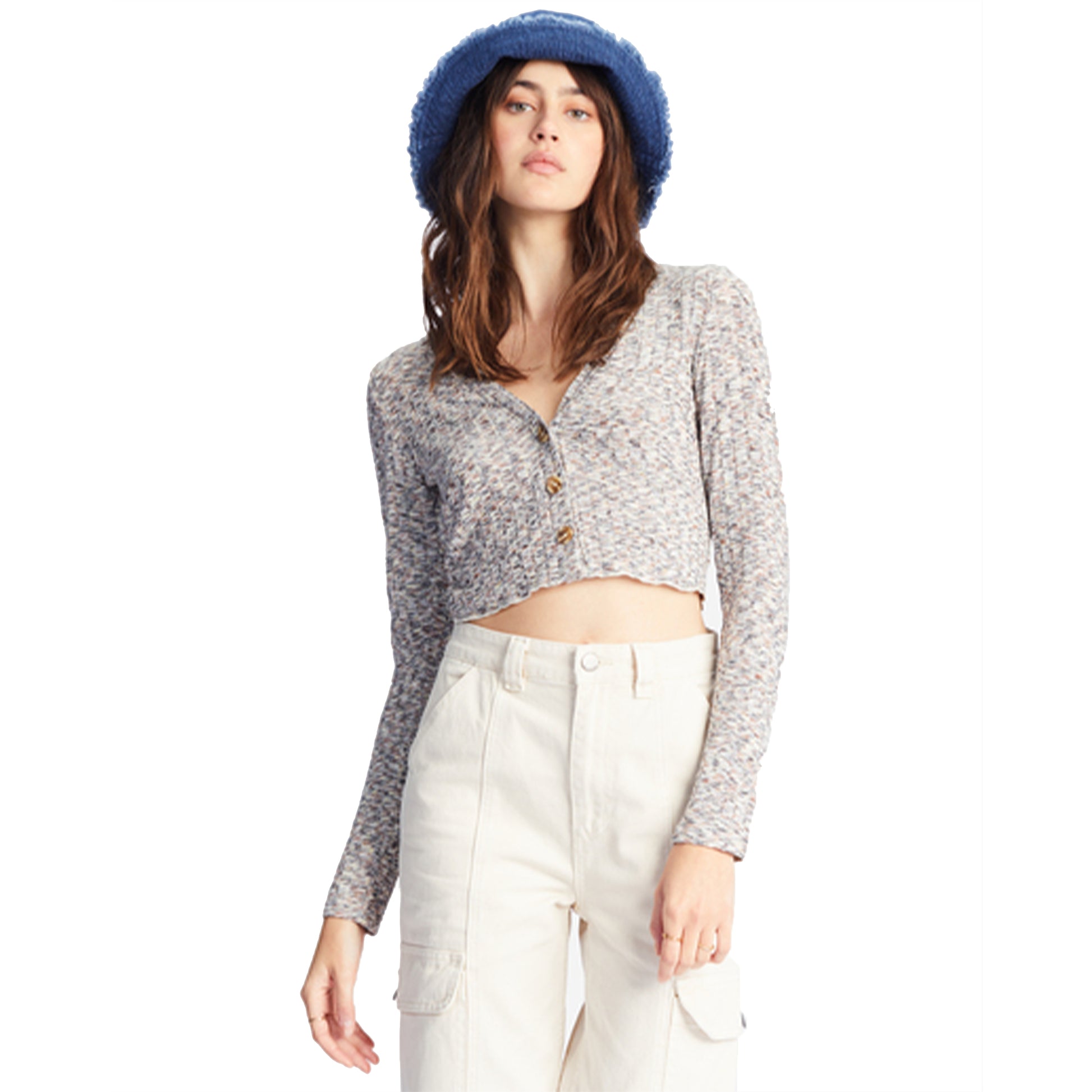 The Sweet Tides top takes inspiration from a cozy grandpa cardigan and gives it a modern-day boost with a slightly cropped length and bodycon fit. Made in ribbed space-dyed knit, this Essentials collection women's long sleeve V-neck top features front buttons and effortless style you can wear anywhere.
