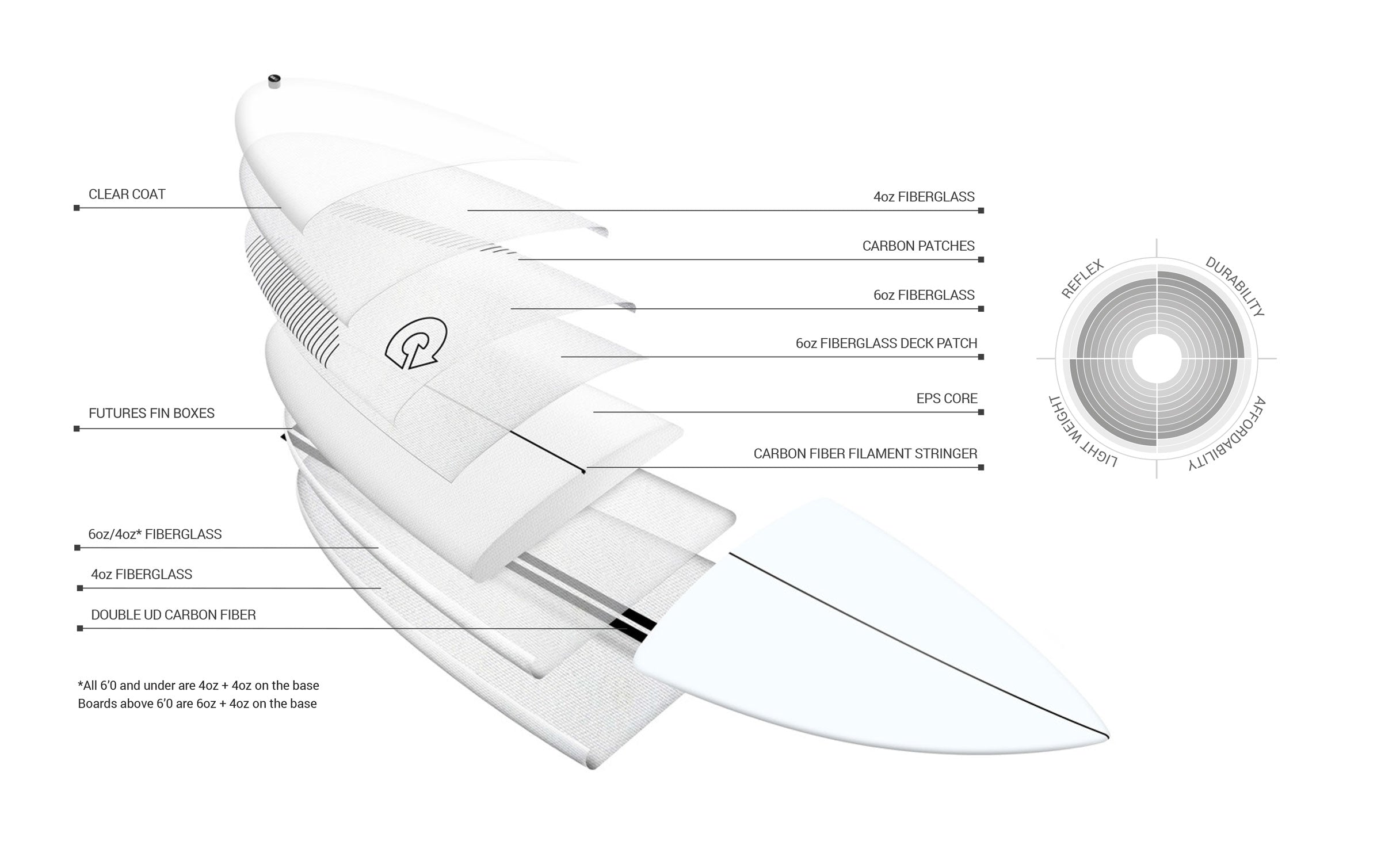 The TEC shortboards have 2 full layers of fiber over the deck and bottom. On the deck we use an extra 6oz deck patch with gives triple layer ding resistance, but doesn't resist the flex along the rail. The addition of a carbon filament stringer and UD carbon twin strips on the base makes these super springy and responsive.
