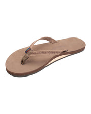 The single layer premier leather sandal is made of top grade nubuck leather; the top sole is embossed with the Rainbow® logo. This model comes with a 1/2" narrow strap, also nubuck leather; it is double stitched, and the nylon toe piece is secured with a box X stitch, all using bonded nylon thread.